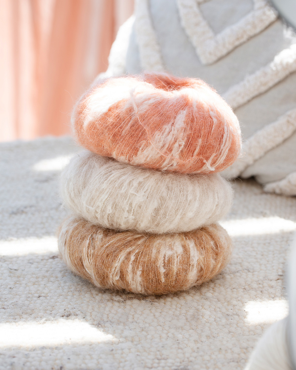 Zartes, zweifarbiges Alpakagarn mit Effektflammen aus Baumwolle.