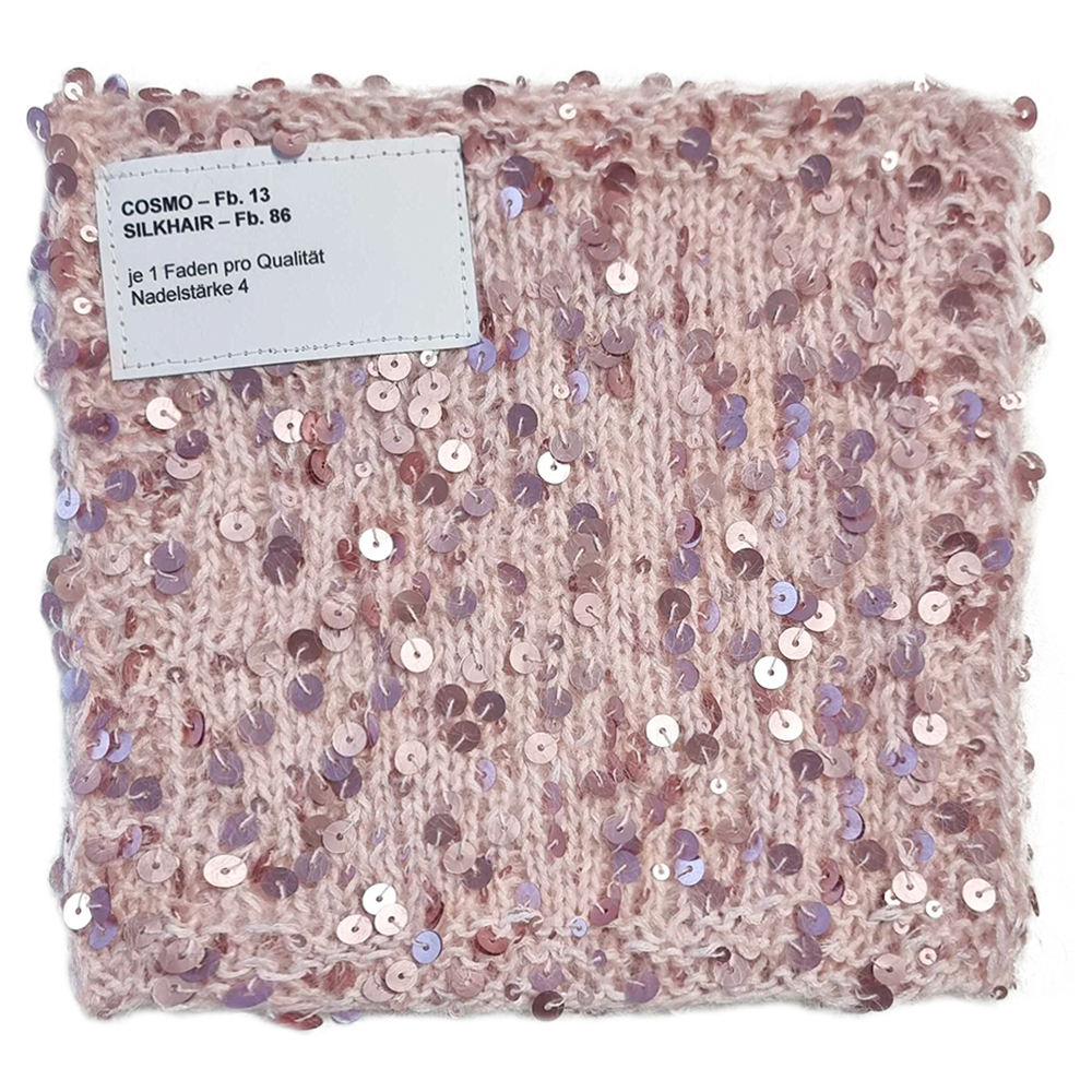Große und kleine Pailletten, wahlweise bunt oder einfarbig, dazu ein Trägerfaden aus Baumwolle: Dieses Beilaufgarn verleiht voluminösen Knits einen galaktischen Glow.