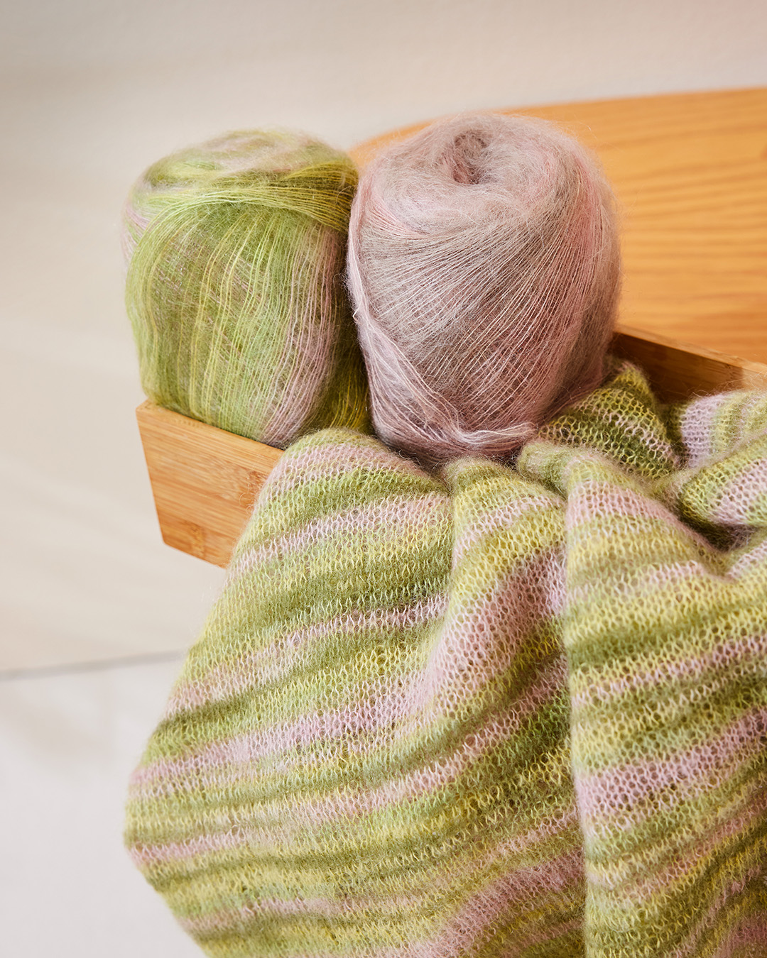 Luftig, leicht und mit sanftem Flausch. Die Kombination aus natürlicher Baumwolle und feinstem Mohair verleiht dem Garn eine zarte Transparenz, angenehme Haptik und eleganten Schimmer.