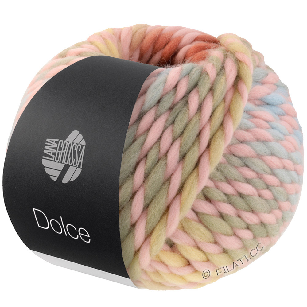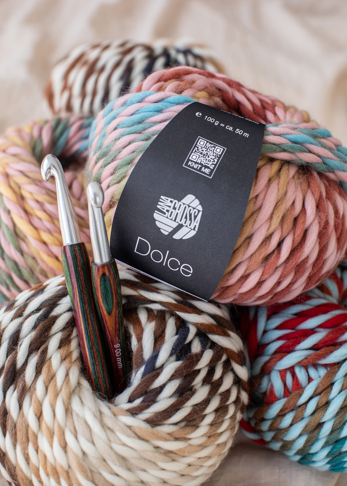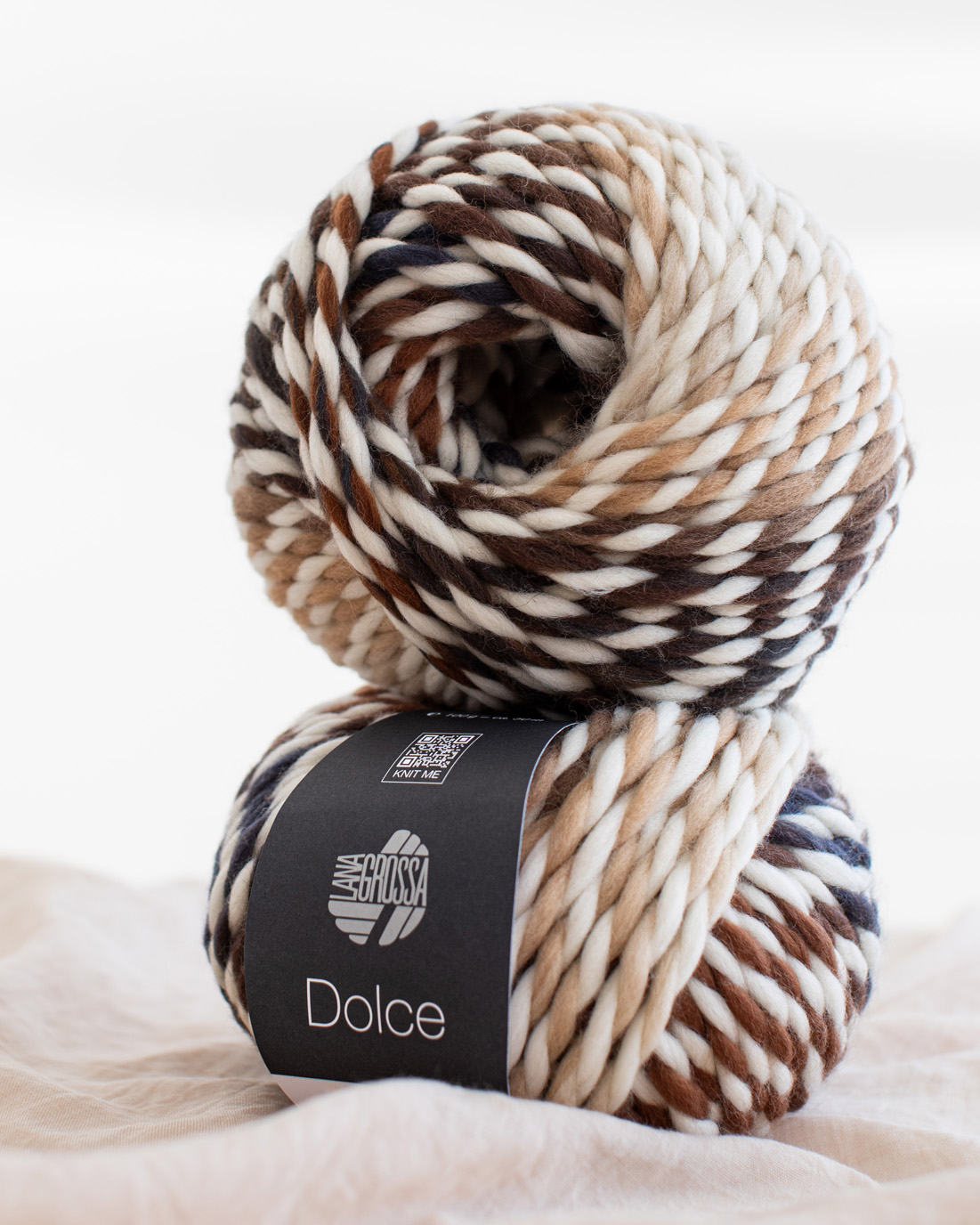 Mit seiner besonders dicken Struktur lassen sich moderne Pullover, Jacken und Accessoires im Handumdrehen stricken. Die einzigartige Optik mit markanten Streifen und Mouliné-Effekten verleiht jedem Projekt Charakter. Ein Muss für alle, die voluminöse Wintergarne lieben. Lana Grossa Dolce eigent sich besonders für Anfänger.