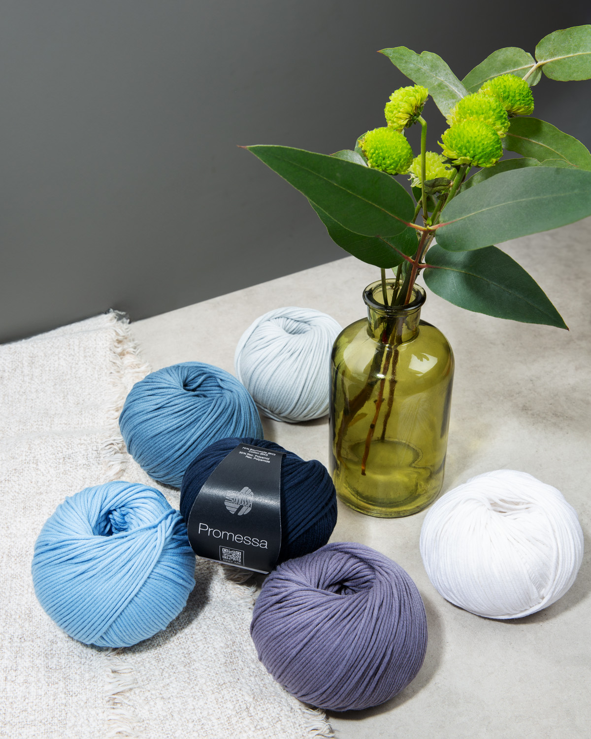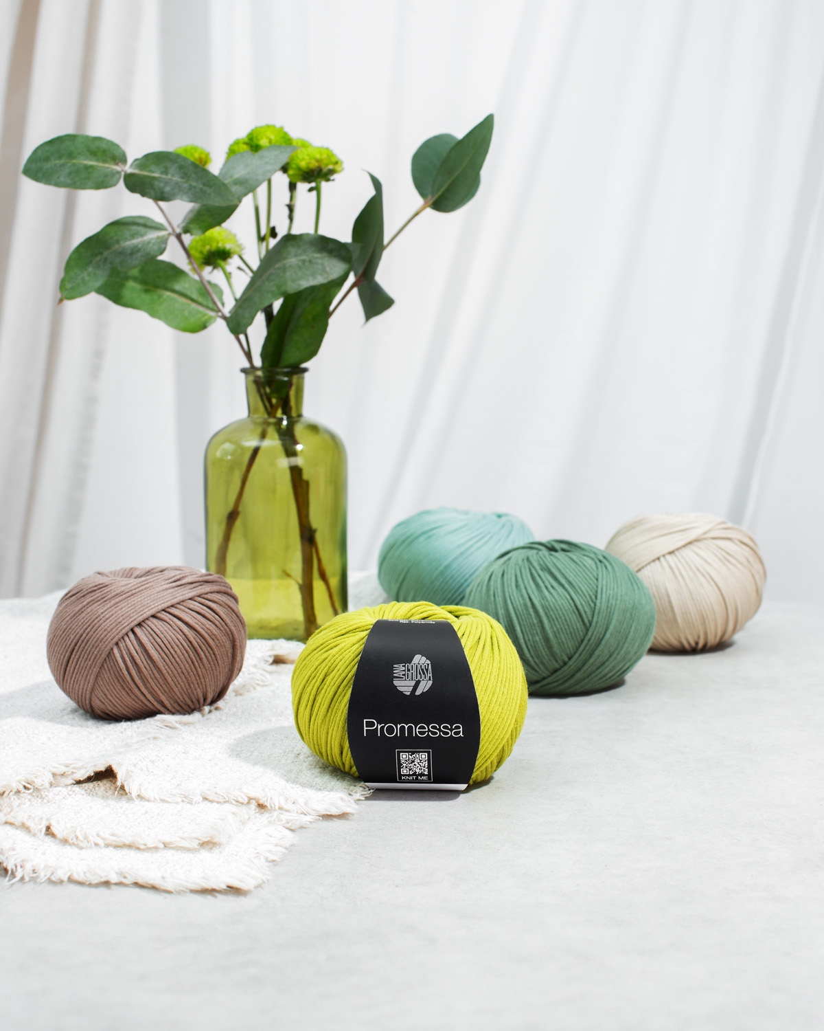 Promessa ist ein weiches, voluminöses Schlauchgarn mit natürlicher Ausstrahlung und modernem Look. Die innovative Mischung aus Bio-Baumwolle und recyceltem Polyamid sorgt für ein angenehm leichtes Tragegefühl, sanften Griff und ein klares Maschenbild.