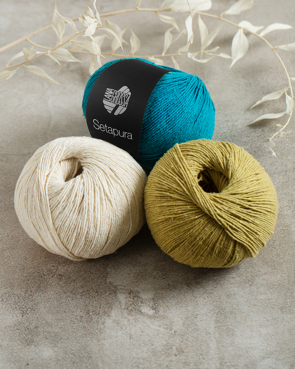 Setapura ist ein hochwertiges Sommergarn aus reiner Seide, das durch seinen edlen Glanz, fließenden Fall und kühlenden Griff begeistert. Die glatte Oberfläche sorgt für ein besonders gleichmäßiges Maschenbild und macht das Garn zur perfekten Wahl für elegante Pullover, Tops, Tücher oder feine Accessoires.