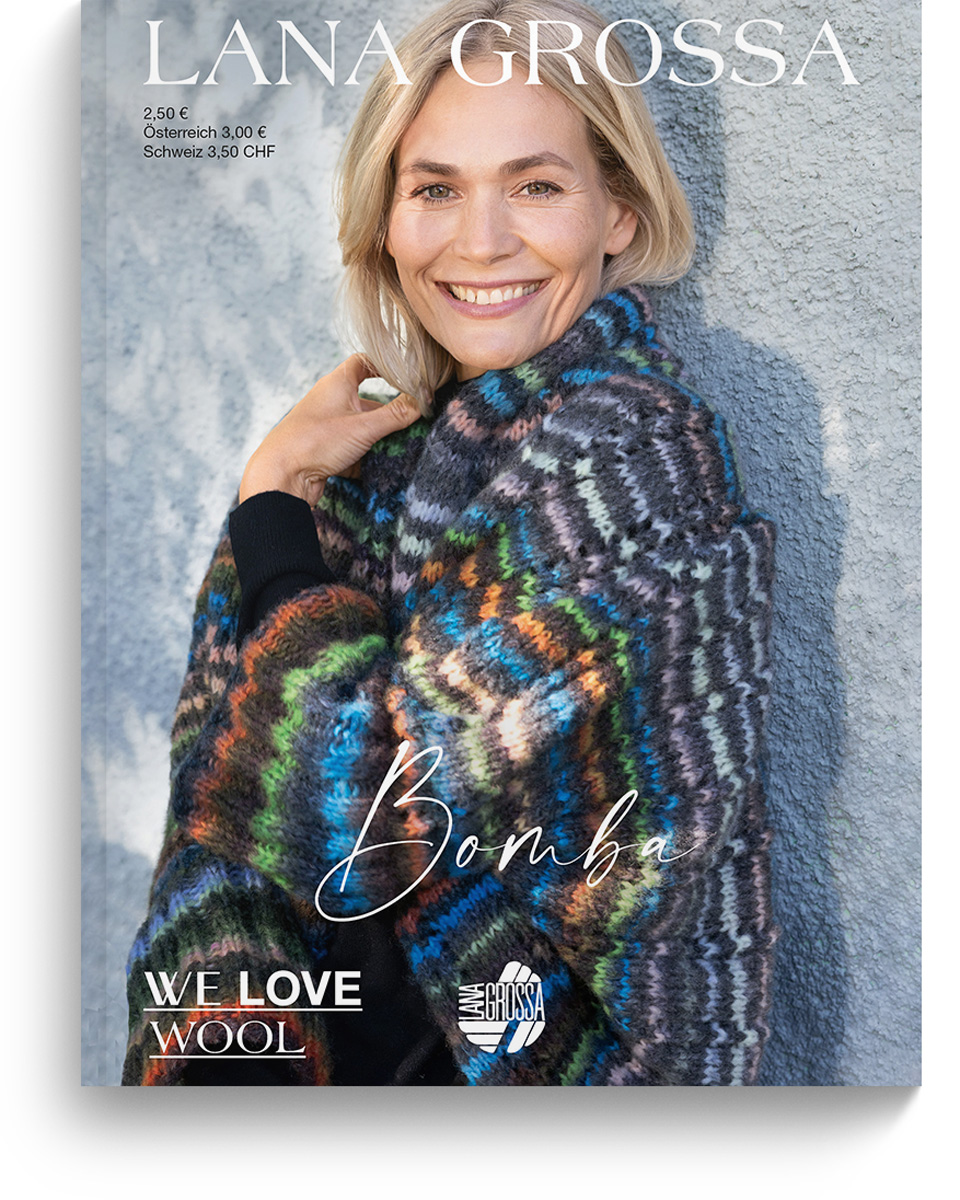 Die Bomba ist der flauschige Gegenentwurf zur Farfalla – unserem bunten Kettgarn aus watteweichen Merinofasern, von dem Sie zu Saisonanfang bestimmt schon viel gehört haben. Wer es also genauso kuschelweich, jedoch voluminöser haben möchte, ist bei unserem Print-Garn Bomba an der richtigen Adresse. Dieses Schätzchen ist in zehn Farben erhältlich. Es besteht zu 85 % aus Schurwolle (Merino extrafein), und hat eine Lauflänge von 290m/100g. Gestrickt wird sie mit Nadelstärke: 5-6. Also worauf warten? Sicher dir sogleich unseren neuen Flyer mit insgesamt neun kostenlosen Anleitungen, damit du auch sofort loslegen können.