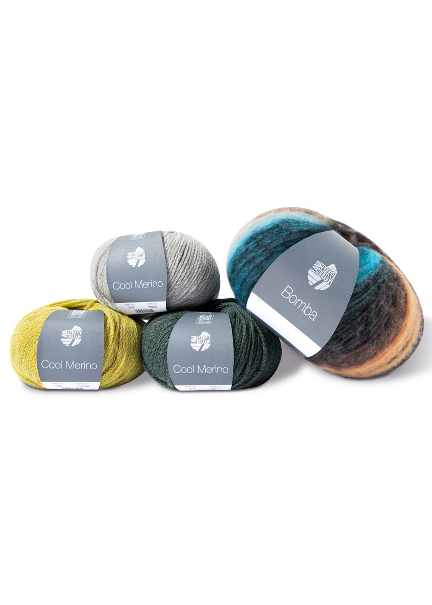 Garn von Lana Grossa, Qualität „Bomba“ (85% Schurwolle (Merino extrafine), 15% Polyamid, LL 290 m/100 g): 100 g (1 Knäuel) in Fb. 7 (Pfirsich/Weiß-/Hell-/Dunkelgrün/ Graupetrol/-braun/Türkisblau); „Cool Merino“ (90% Schurwolle (Merino), 10% Polyamid, LL 150 m/50 g): Je 50 g in Fb. 19 (Grün) in Fb. 33 (Gelb) 50 g und in Fb. 13 (Hellgrau)