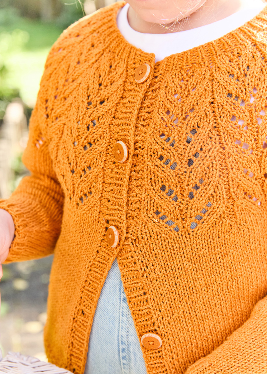 Lana Grossa-Qualität „Landlust- Sommerseide“ (50 % Seide, 50 % Baumwolle, LL ca. 170 m/50 g), 150 g in Kürbis (Fb 53); je 1 Rundstricknadel Nr. 3 und Nr. 3,5, 60 cm lang, 5 Knöpfe in Orange, ø 18 mm.