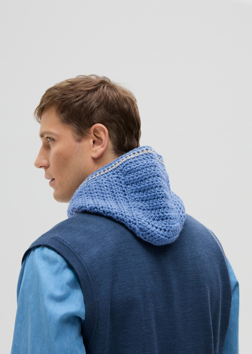Lana Grossa „Cool Merino Big“ (90% Schurwolle (Merino), 10% Polyamid, LL = 90 m/50 g): 100 g Azurblau (Fb 233), 50 g Hellgrau (Fb 218); Häkelnadel Nr 7; Maschenmarkierer.