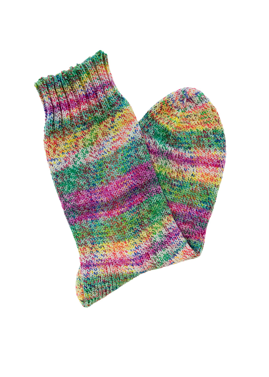 Variante F: Lana Grossa „Landlust Die Sockenwolle“ (80 % Schurwolle (Merino), 20 % Polyamid, Lauflänge = 420 m / 100 g): 100 g Grün/Rot/Blau/Pink/Gelb/Vanille Meliert (Fb 218); Nadelspiel Nr. 2,5