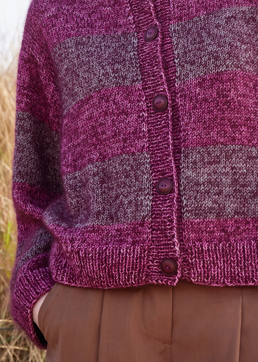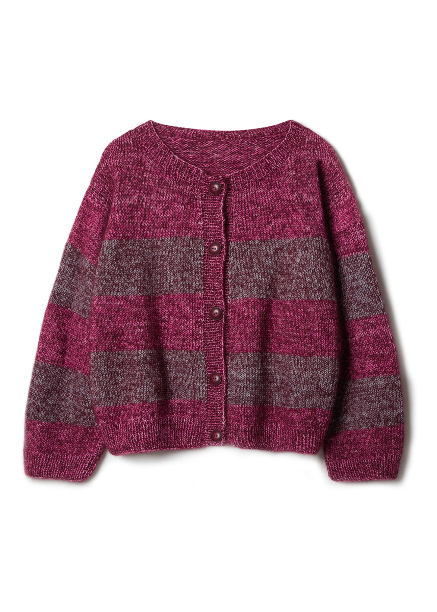 Lana Grossa Cool Wool Vintage (100% Schurwolle (Merino extrafine), LL = ca. 160 m/50 g), 200 (250 - 300 - 300) g in Pink (Fb 7389) und 150 (200 - 250 - 250) g in Hellgrau (Fb 7369) sowie Lana Grossa Silkhair (70% Mohair (Superkid), 30% Seide, LL = ca. 210 m/25 g), 150 (175 - 200 - 225) g in Dunkelrot (Fb 177). Stricknd Nr 4,5 und Nr. 5. 5 Knöpfe, ca. 25 mm Ø.