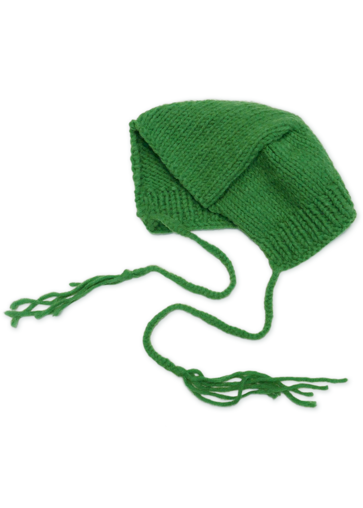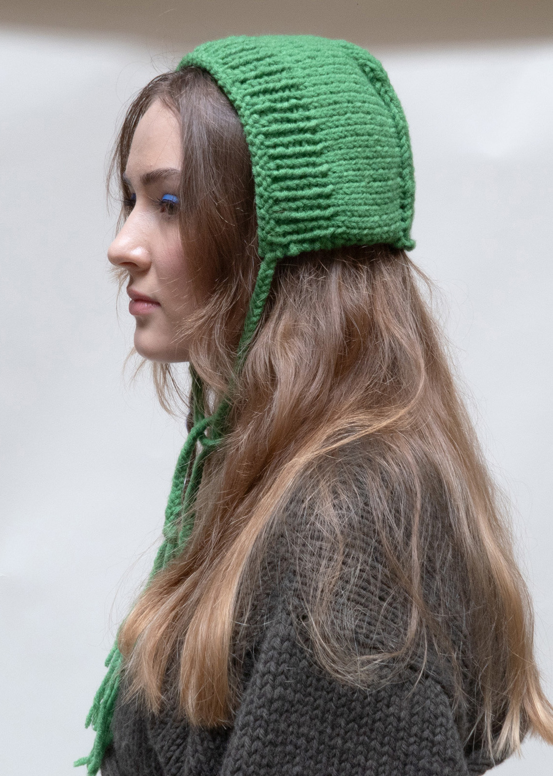 Die Cappi wird vom Hinterkopf begonnen und dann in einem Stück nach oben gestrickt. Am Ende werden die Bänder noch extra drangestrickt, sie können aber auch einfach geflochten werden.