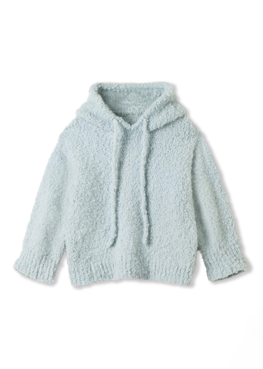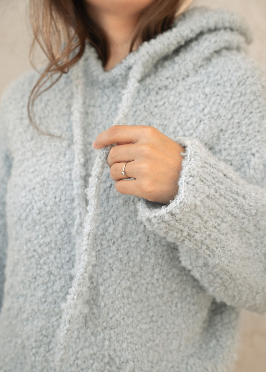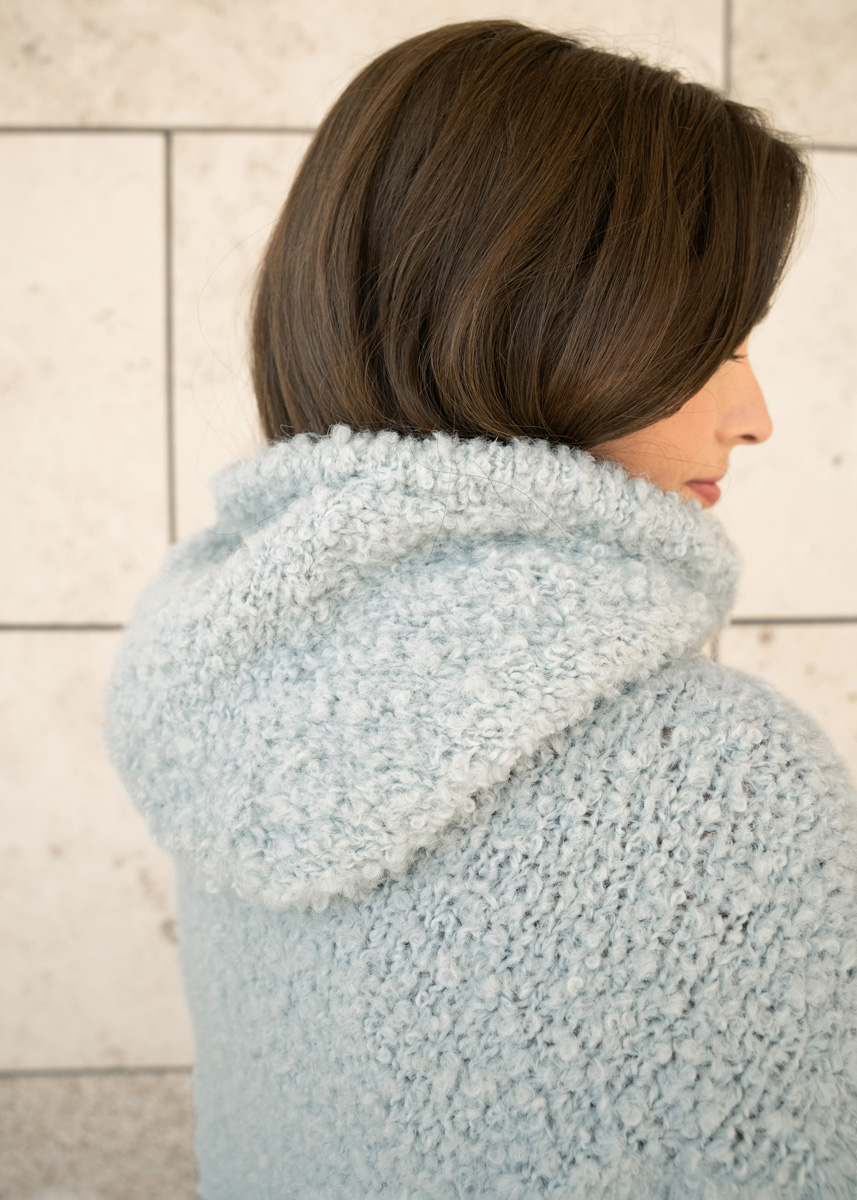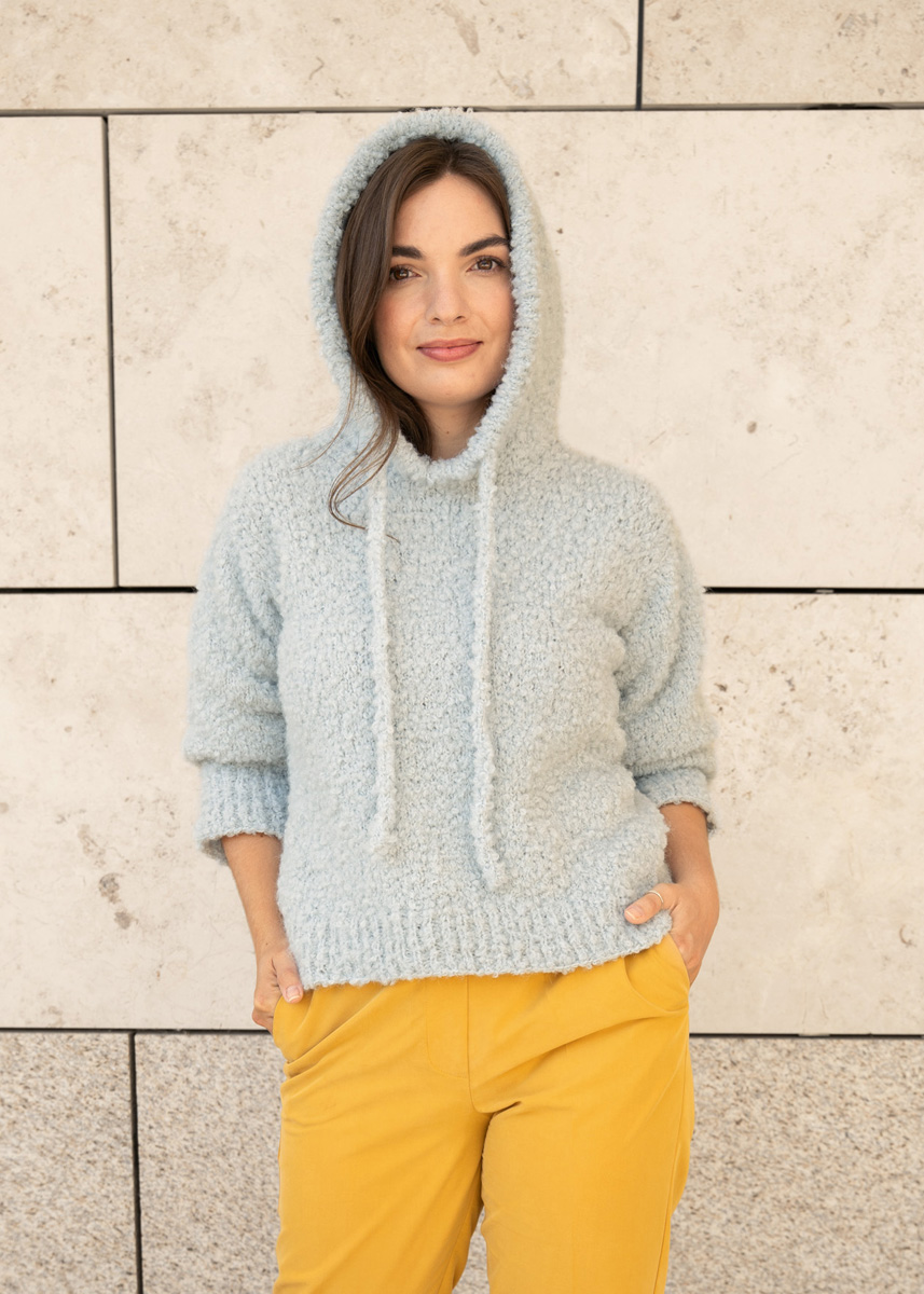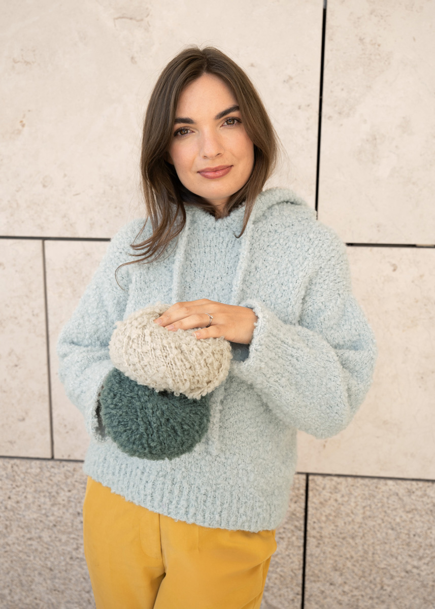 Der Bouclehoodie setzt auf eine klare, nahtlose Konstruktion mit weichem Fall und sportlicher Linie. Entwickelt wurde er so, dass sich Form und Sitz organisch aus der Strickrichtung ergeben: von oben nach unten, ohne Nähte und mit dezenten Formgebungen, die im getragenen Zustand besonders sauber wirken.