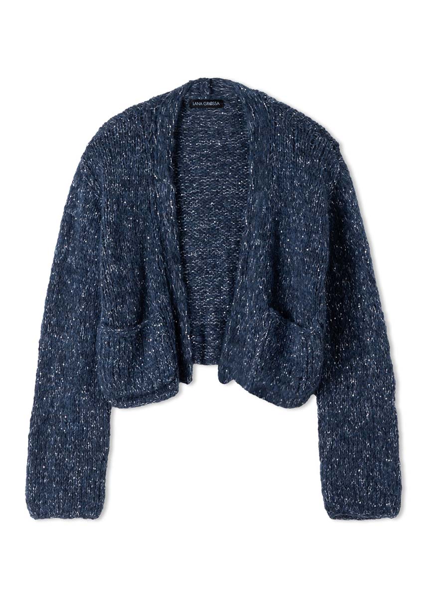 Bling! Pailletten sind Trend und sorgen bei diesem Cardigan für einen silbrigen Glow. Zur kurzen Form gibt’s überlange Ärmel. Gestrickt wird doppelfädig und hauptsächlich glatt rechts.