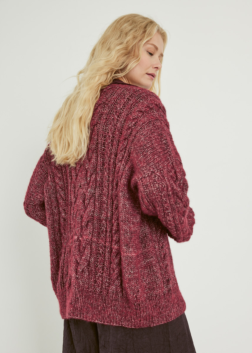 Trendfarbe Burgunder und drei verschiedene Zopfmuster bringen Ausdruck in den Top-Down-Cardigan mit Rundhalsausschnitt. Die vorderen Kanten ziert eine stabile Blende aus Hebemaschen.