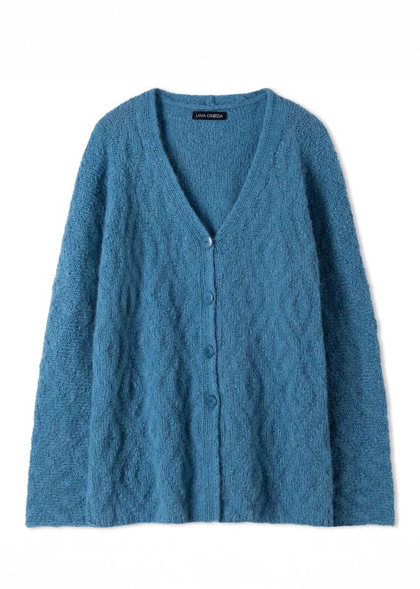 Lana Grossa Nebbia (55% Schurwolle (Merino extrafein), 45% (Baby) Alpaka, Lauflänge 170 m/50 g), 400 g in Taubenblau (Fb 5); Stricknadeln Nr 5; 1 Rundstricknadel Nr 5, 120 cm lang; 4 blaue Knöpfe von Union Knopf, 25 mm Ø, Art. 454233, Fb 64.