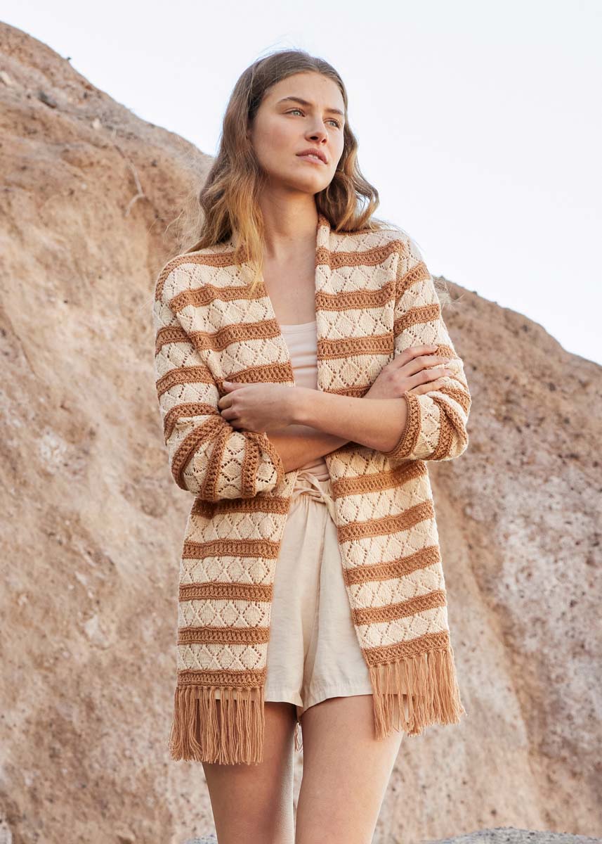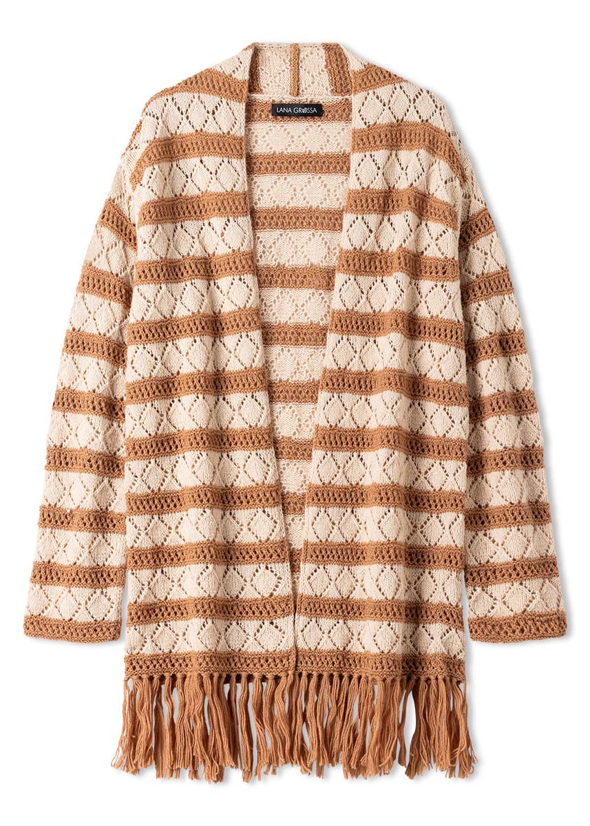 Beim geraden, hüftlangen Cardigan wechseln Rauten- und Lochmuster streifenweise. Dazu gibt es lange Fransen, die jeden Hüftschwung zum Schauspiel machen.