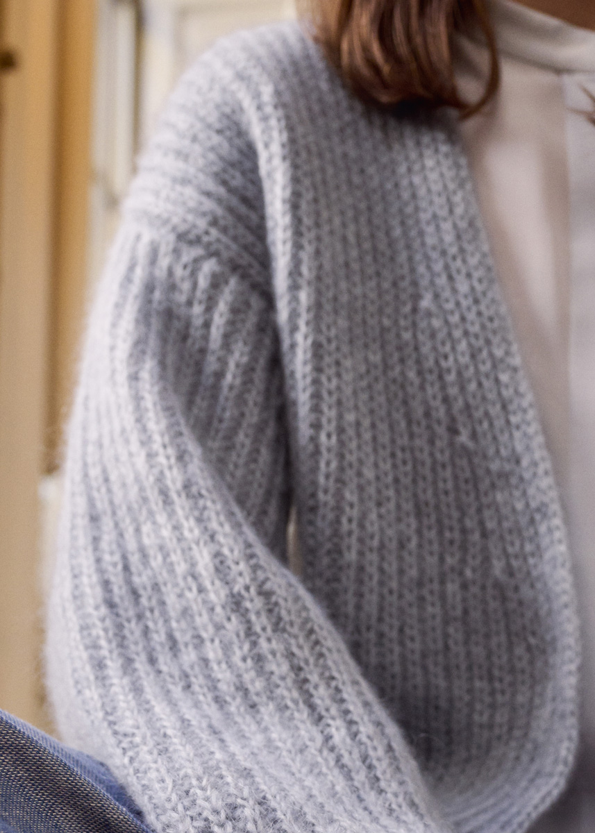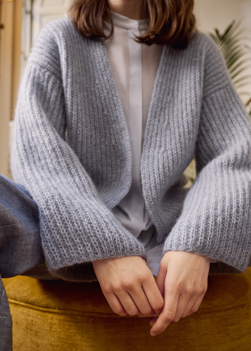 Lana Grossa-Qualität „Superkid Seta“ (65 % Mohair (Superkid), 35 % Seide, LL = ca 100 m/25 g): ca 325 (350 - 375 - 400) g Hellgrau (Fb 2); Stricknadeln Nr 4 und 4,5.