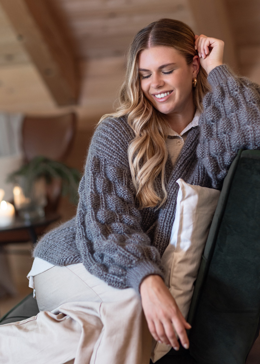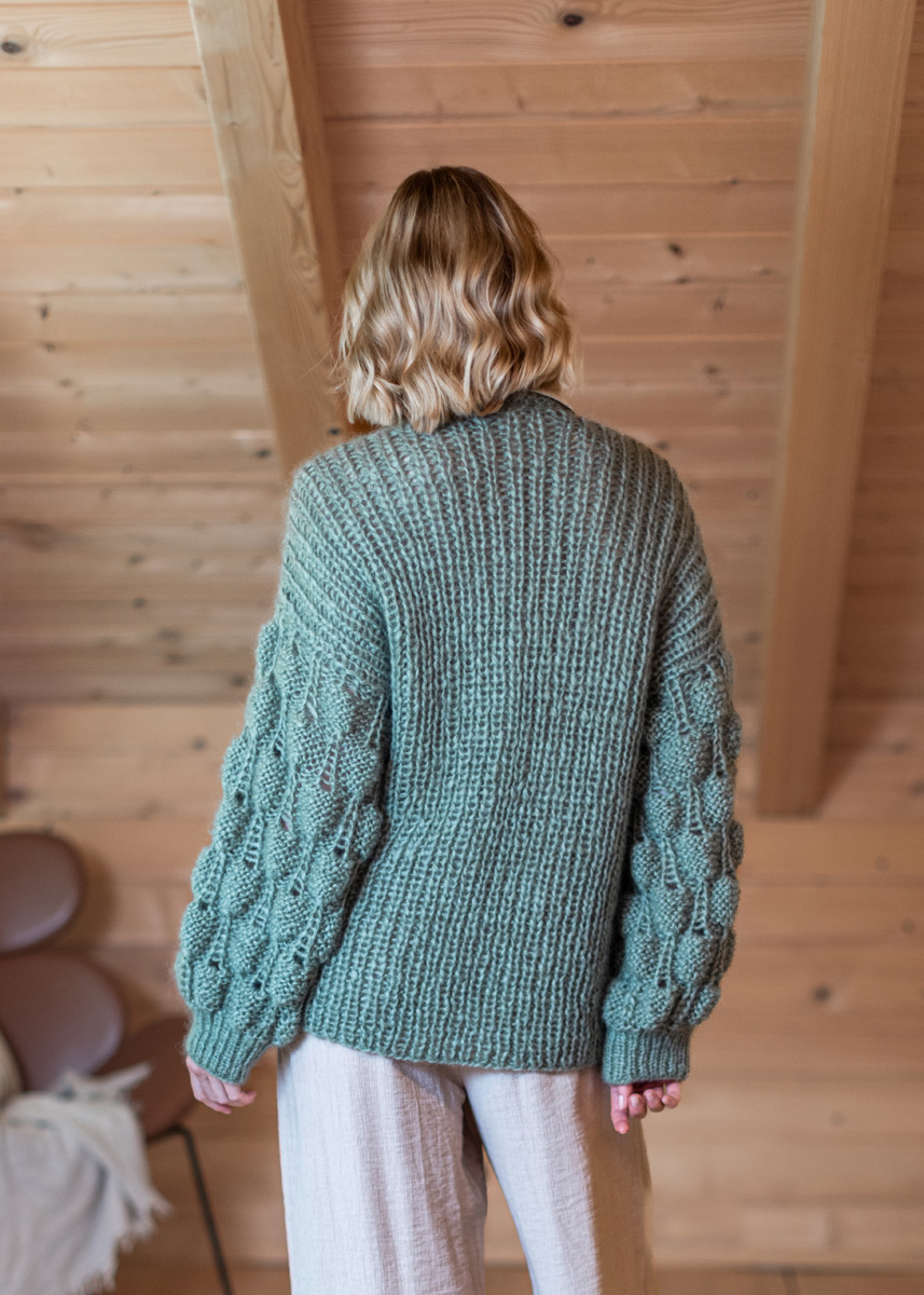 Der Cardigan wird durchgehend mit doppeltem Faden gestrickt. Rücken- und Vorderteile werden bis zu den Armausschnitten in einem Stück gestrickt. Die Maschen für die Ärmel werden anschließend aus dem Armausschnitt aufgefasst. Das Modell hat eine Gesamtlänge von 60 (62 - 64 - 66 - 68 - 70) cm und eine Brustmehrweite von 4 cm bei 80 cm Brustumfang (3 cm bei 88 cm Brustumfang - 4 cm bei 96 cm Brustumfang - 3 cm bei 104 cm Brustumfang - 4 cm bei 116 cm Brustumfang - 3 cm bei 128 cm Brustumfang).