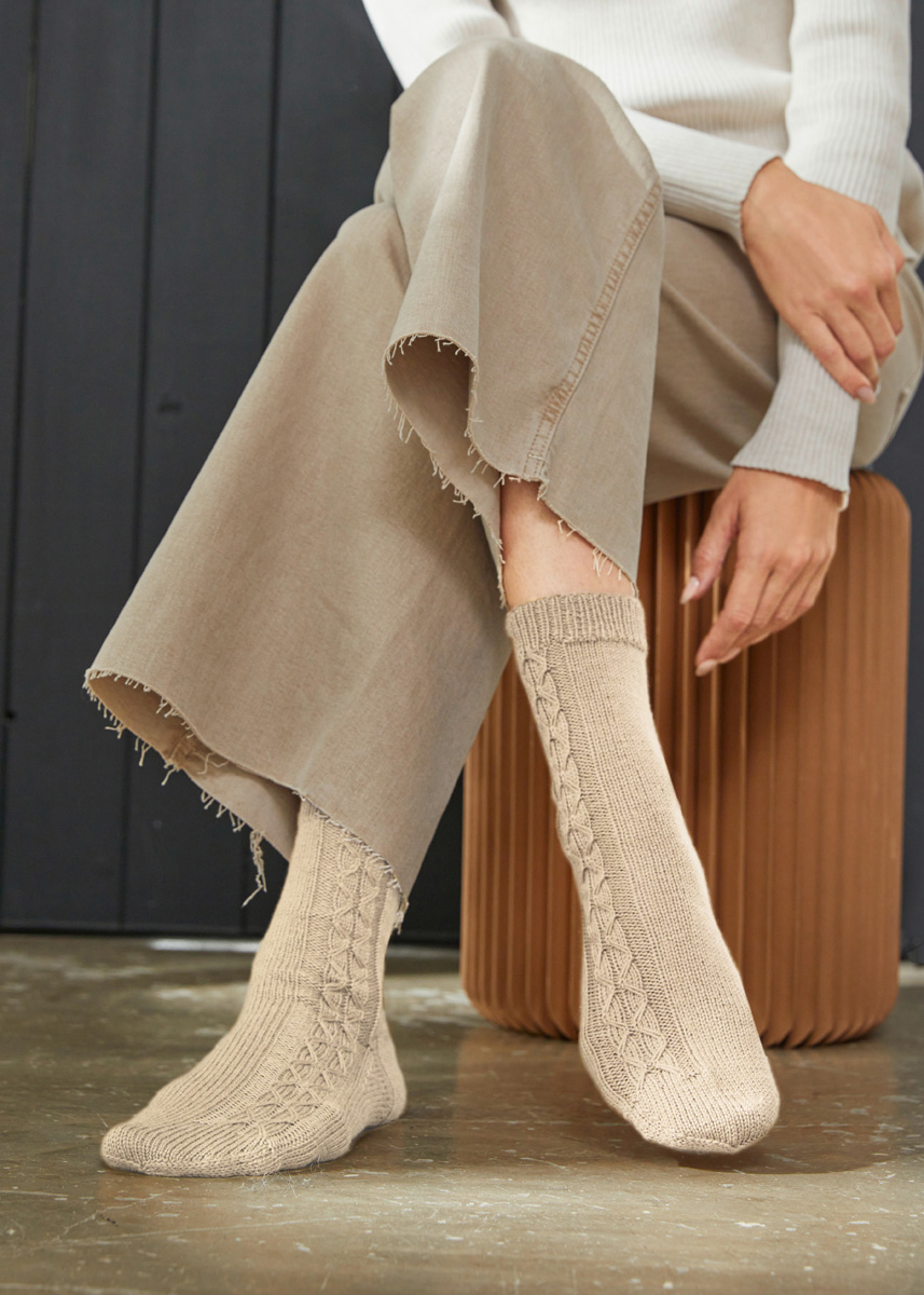 Lana Grossa „Meilenweit 50g Cashmere“ (70 % Schurwolle, 25 % Polyamid, 5 % Kaschmir, Lauflänge = 210 m / 50 g): 100 g Beige (Fb 61); Nadelspiel Nr. 2,5 und 1 Hilfs- oder Zopfnadel