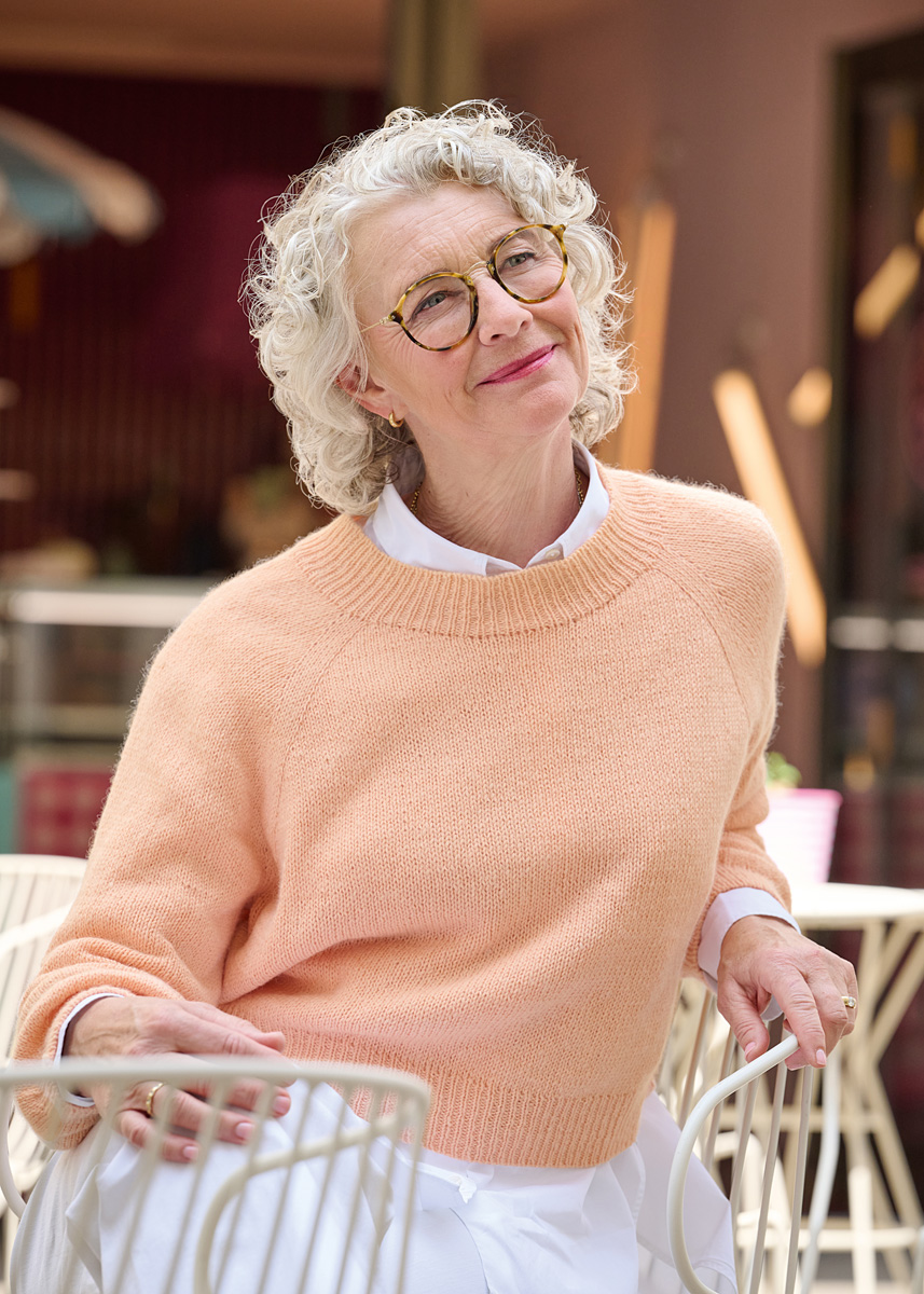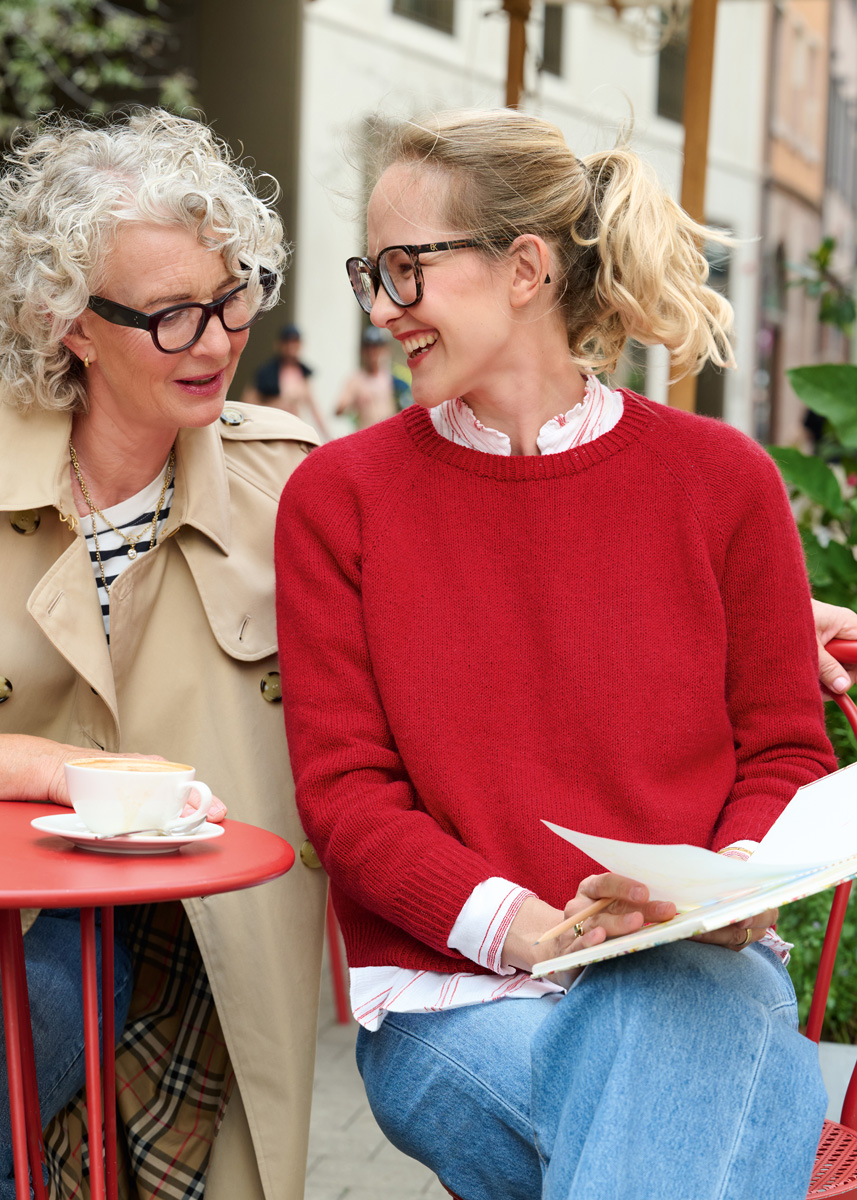 Lana Grossa Ecopuno 72 % Baumwolle, 17 % Schurwolle (Merino), 11 % Alpaka (Baby), LL = 215 m / 50 g in Apricot (Fb. 99), Rosa (Fb. 48) oder Kirschrot (Fb. 47). Eine Rundstricknadel der Stärke 3,5 mm oder 4,0 mm, eine Rundstricknadel um 1,5 – 2 Stärken weniger für die Bündchen, Seillängen zwischen 40 und 100 cm, je nach Größe und abhängig von der Stricktechnik, je ein Nadelspiel in beiden Stärken für die Ärmel und Bündchen, 9 Maschenmarkierer: MM0 bis MM8 Maschenkordel oder Seil zum Stilllegen der Ärmelmaschen.