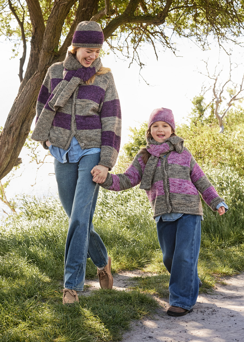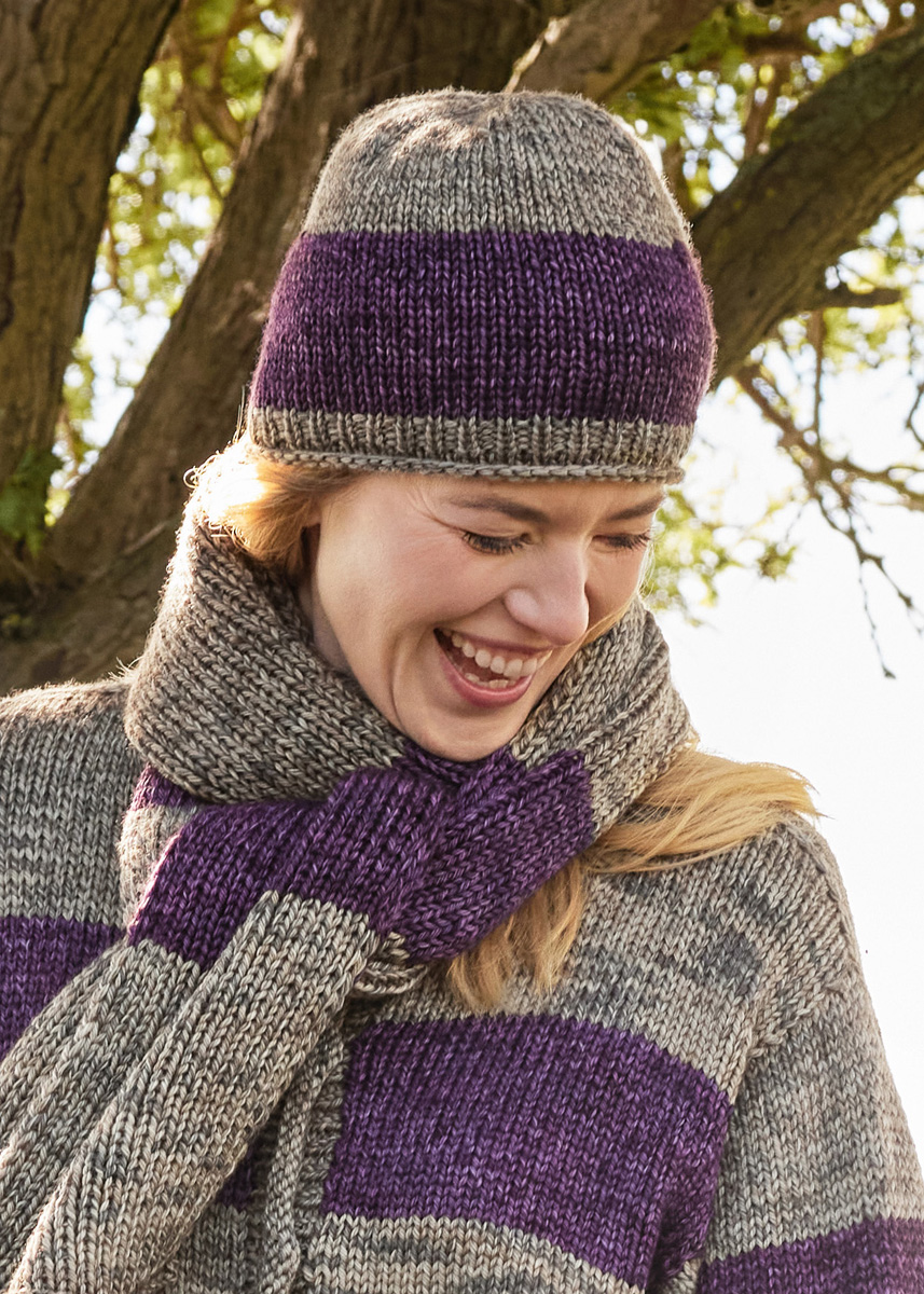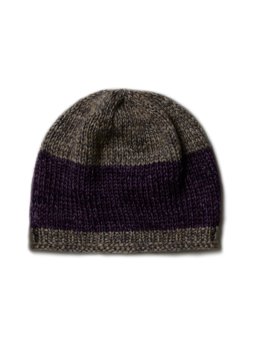 Lana Grossa Vintage Chunky (100 % Schurwolle (Merino extrafine), LL = ca 80 m/50 g), 50 g in Antikviolett/Aubergine (Fb 8) und 50 g in Beige/Khaki (Fb 1). Spielstrick-Nd (Nadelspiel) Nr. 5 und Nr 6. 6 MM.