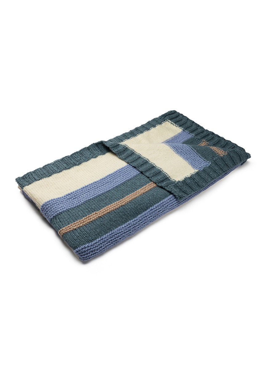 Lana Grossa-Qualität „Alta Moda Cashmere 16” (78 % Schurwolle (Merino), 12 % Kaschmir, 10 % Polyamid, LL = ca. 110 m/50 g): ca. 400 g Rauchblau (Fb. 53), ca. 350 g Himmelblau (Fb. 73), ca. 250 g Rohweiß (Fb. 16) und ca. 100 g Beige (Fb. 76); 1 Rundstricknadel Nr. 7,5, 120 cm lang.