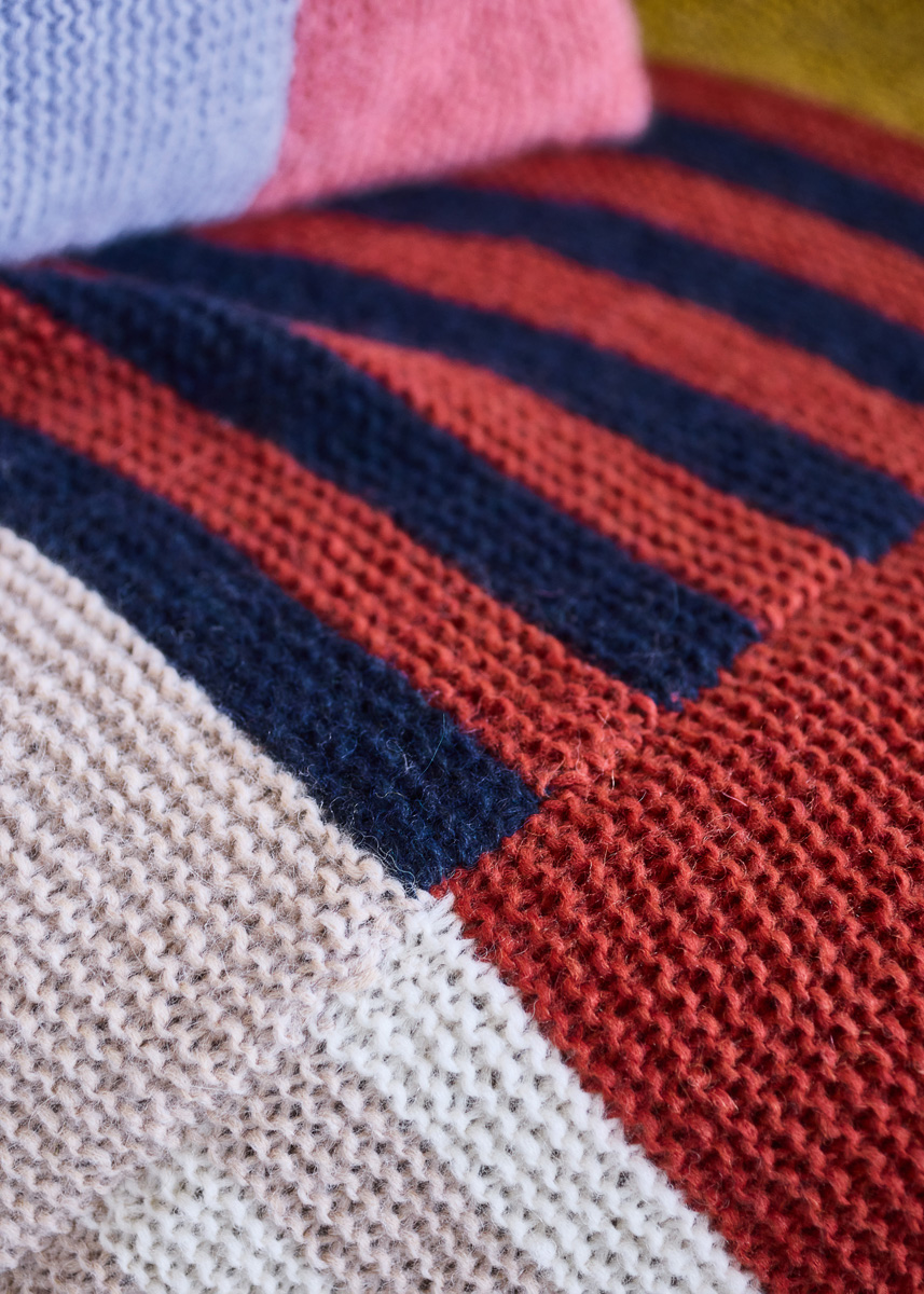 Lana Grossa-Qualität „Brigitte No. 2” (47 % (Baby) Alpaka, 45 % Baumwolle, 8 % Schurwolle (Merino), LL = ca. 140 m/50 g): je ca. 250 g Nachtblau (Fb. 5) und Hellbeige (Fb. 47), je ca. 200 g Rohweiß (Fb. 16), Senfgelb (Fb. 67), Rost (Fb. 59) und Zartlila (Fb. 78) und je ca. 150 g Lachs (Fb. 46) und Pfirsich (Fb. 55); 1 Rundstricknadel Nr. 6, 120 cm lang, 1 Wollhäkelnadel Nr. 5.