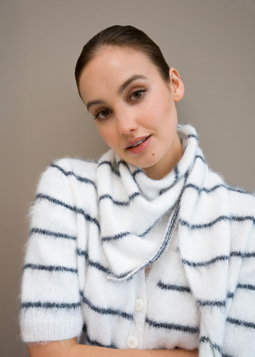 Lana Grossa Finito (73 % Baumwolle, 27 % Polyamid, LL 150 m/50 g), 100 g Weiß (Fb 1), 50 g Schwarz/ Creme (Fb 16); Rundstricknadel Nr 3,5, Länge 60 cm