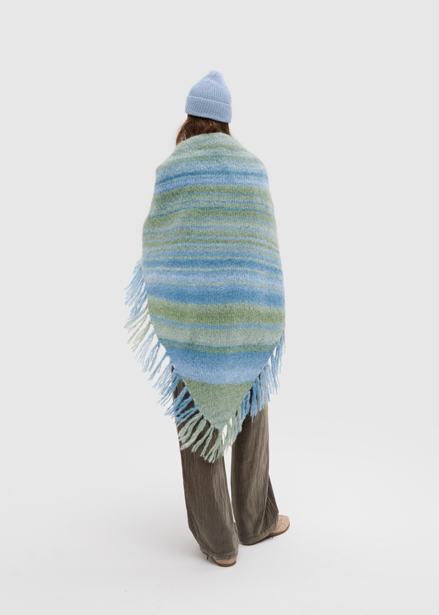Lana Grossa „Gigante“ (70% Alpaka (Fine), 30% Polyamid, LL = 300 m/100 g): 300 g Schilf-Graugrün/ Grau-/ Rauchblau (Fb 16); 1 lange Rundstrick-Nd Nr 6 und 1 Häkelnadel Nr 6.