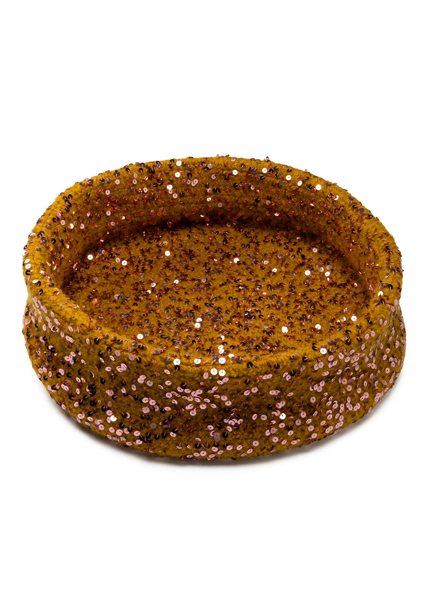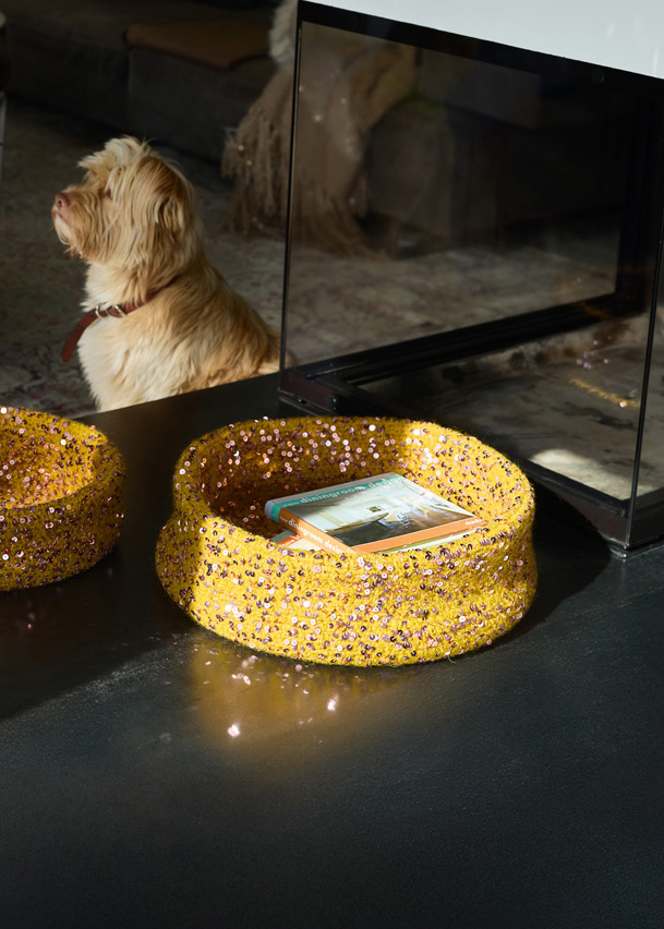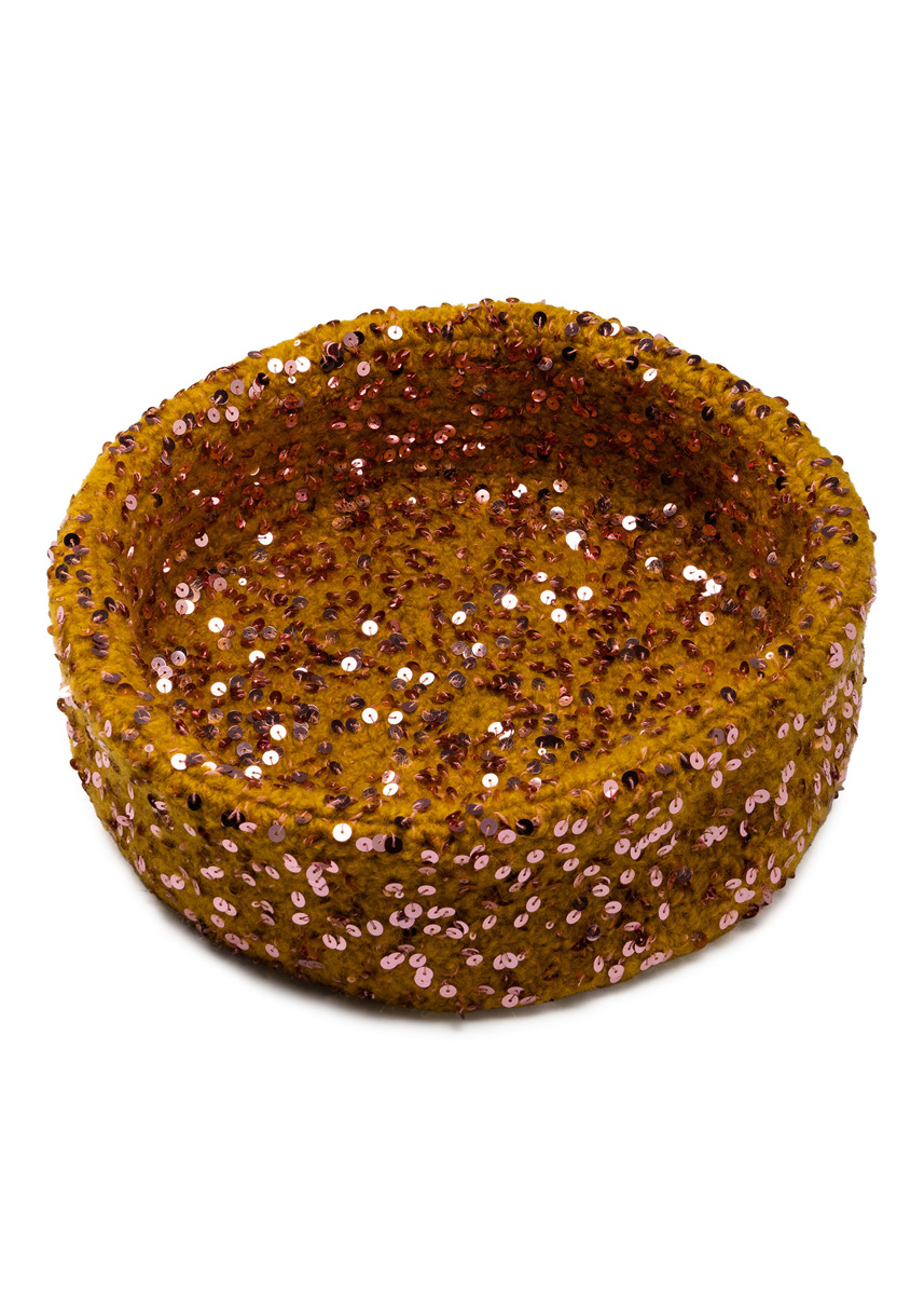 Lana Grossa-Qualität „Feltro” (100 % Schurwolle, LL = ca. 50 m/50 g): große Schale: ca. 700 g Senf (Fb. 125) und Lana Grossa-Qualität „Cosmo” (100 % Baumwolle (plus Pailletten), LL = ca. 260 m/100 g): große und kleine Schale: je ca. 100 g Altrosa (Fb. 14); 1 Wollhäkelnadel Nr. 7.