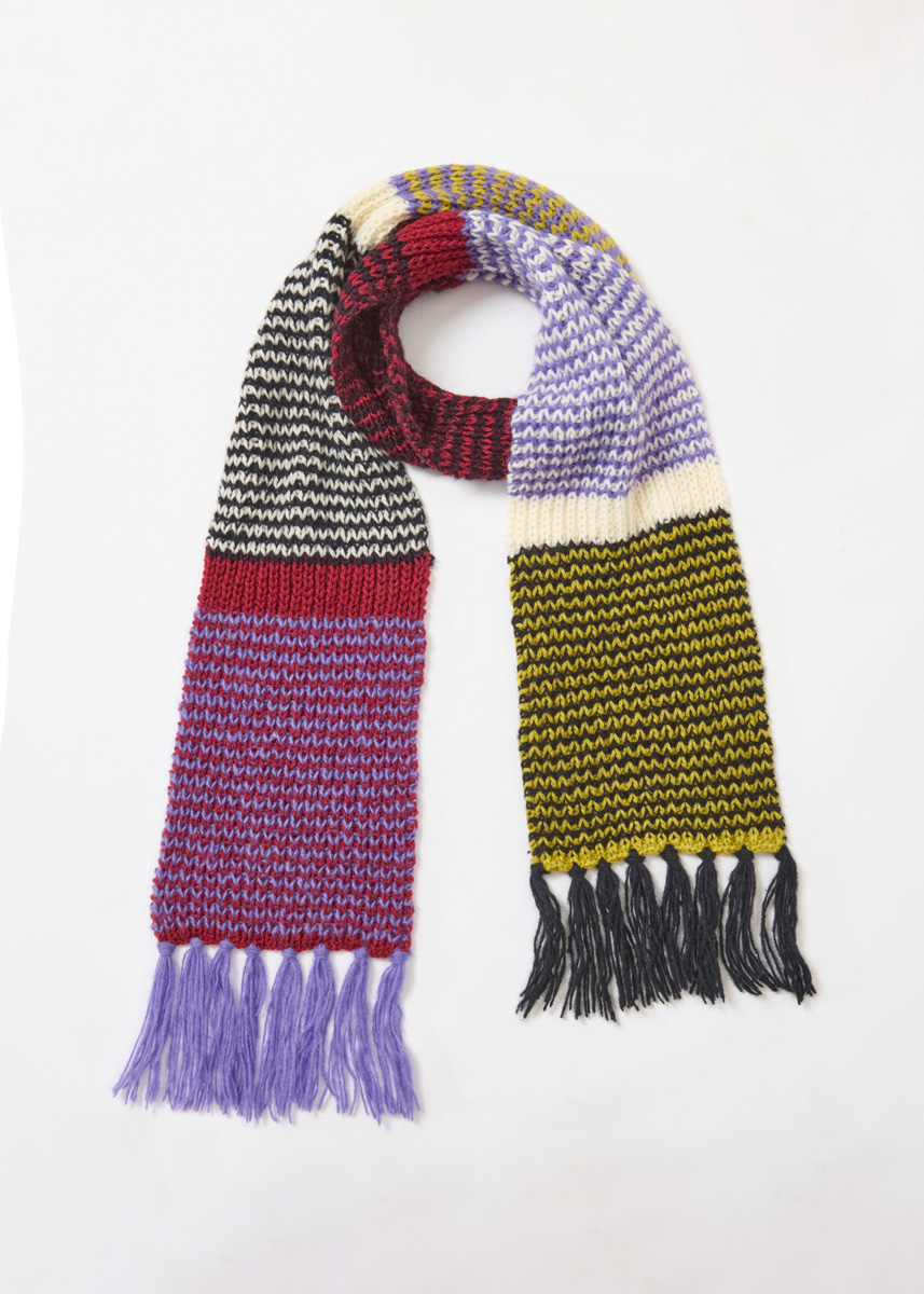 Die Farben des Fransenschals mit Streifen passen im Muster-Mix perfekt zum Puschelpullover (Modell 4) dazu.