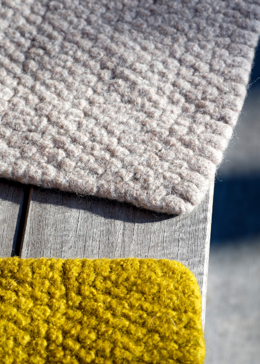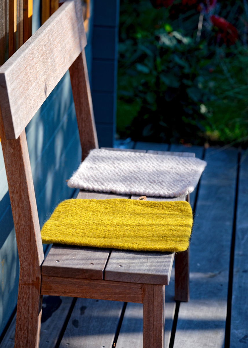 Lana Grossa-Qualität „Landlust- Die-Filzwolle“ (100% Schurwolle, LL ca. 100 m/100 g), je 200 g in Sand Meliert (Fb 5009) bzw. in Senf Meliert (Fb 5019); Stricknadeln Nr. 10, als Verschluß: je ein Leder-Riegel (5 x 1,8 cm mit Löchern zum Aufnähen) und ein 25 x 1,8 cm breites Lederband mit Druckknopf (beides von Leder Baumann).