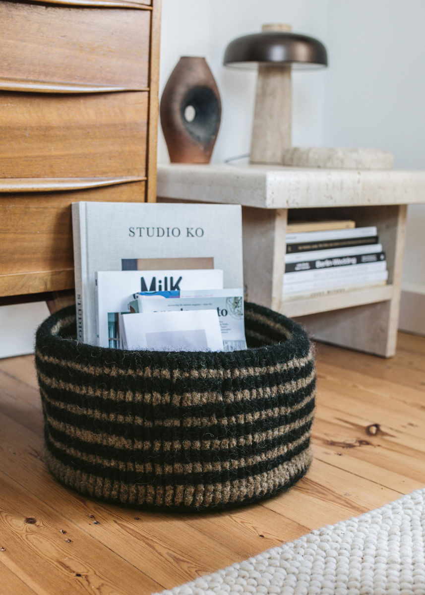 Dieser in Runden gearbeitete Korb hat keine Nähte und wirkt darum besonders schlicht. Zuerst entsteht der Boden. Ist er fertig, wird der Rand ohne weitere Zunahmen angestrickt.