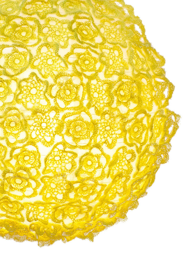 Holt die Sonne ins Haus: Die gelbe Deckenlampe, die aus einer Papierleuchte und aufgeklebten Häkelblüten besteht.