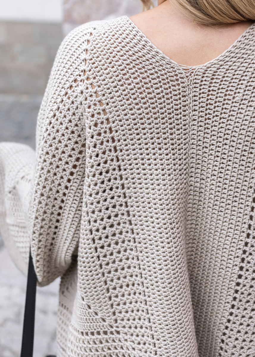 Die Jacke besteht aus zwei Sechsecken, die jeweils ausgehend vom Unterarm in Runden gehäkelt werden. Das Modell hat eine Länge von 58 (62 - 67) cm und eine Brustmehrweite von 36-28 cm bei 80-88 cm Brustumfang (36-28 cm bei 96- 104 cm Brustumfang - 36-24 cm bei 116-128 cm Brustumfang).