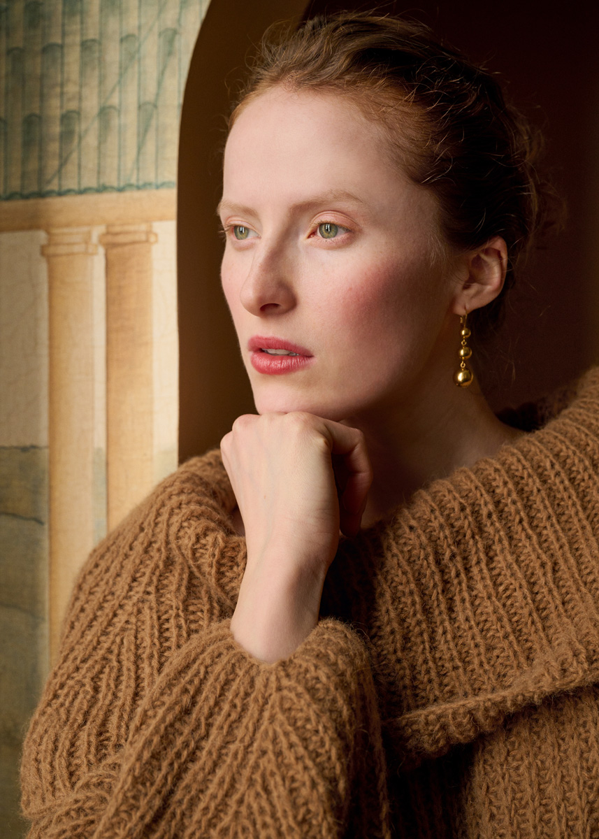 Ein spektakulärer Dachkragen und interessant geminderte Saumabschlüsse (Ärmel): Der Pullover im Halbpatent zitiert die feminine Eleganz der 1950er.