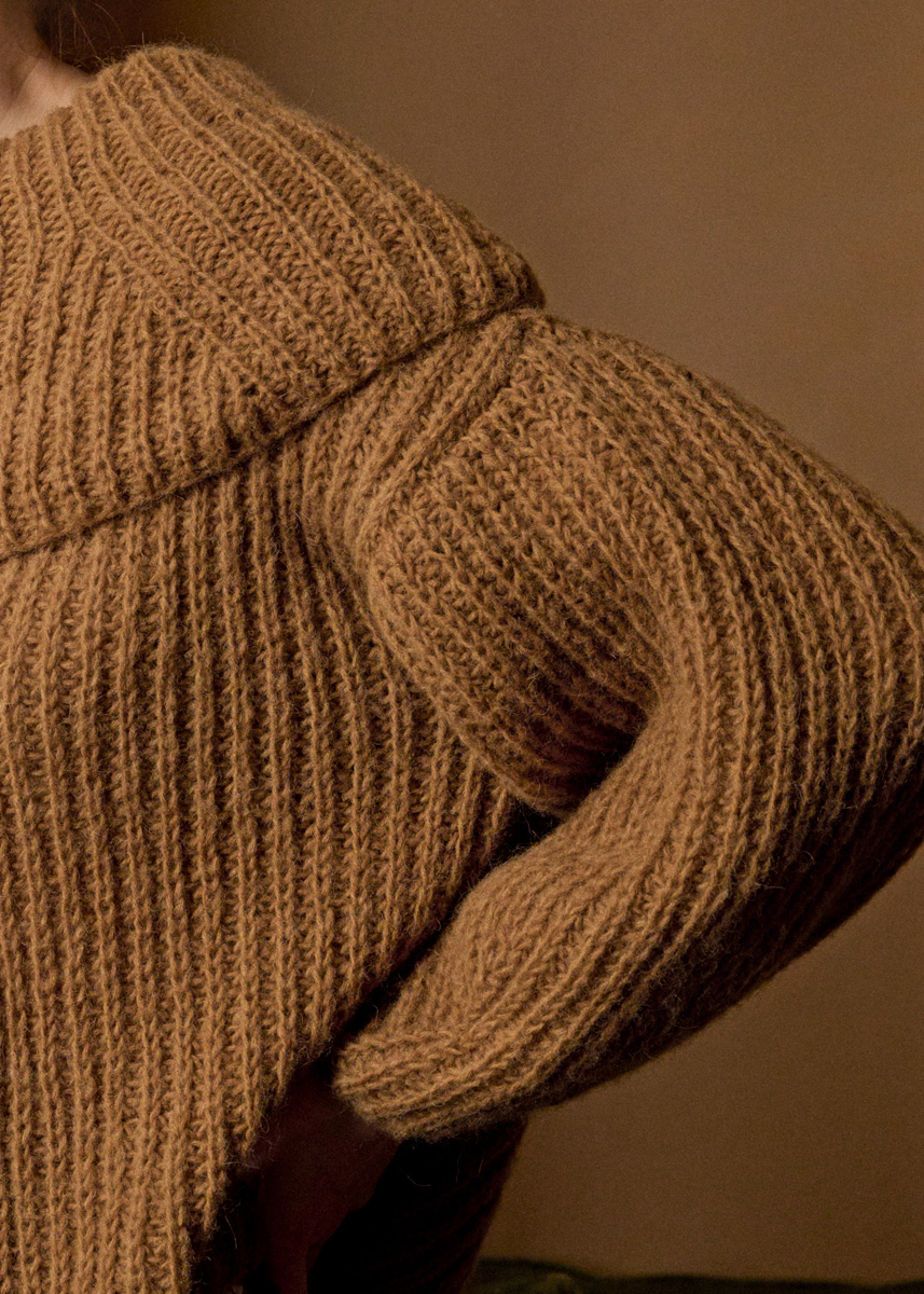 Lana Grossa-Qualität „Nebbia“ (55 % Schurwolle (Merino extrafine), 45 % Alpaka (Baby), LL = ca 170 m/50 g): 400 (450 - 450 - 500) g Camel (Fb 12); Stricknadeln Nr 5,5 und 6; 1 kurze Rundstricknadel Nr 6.