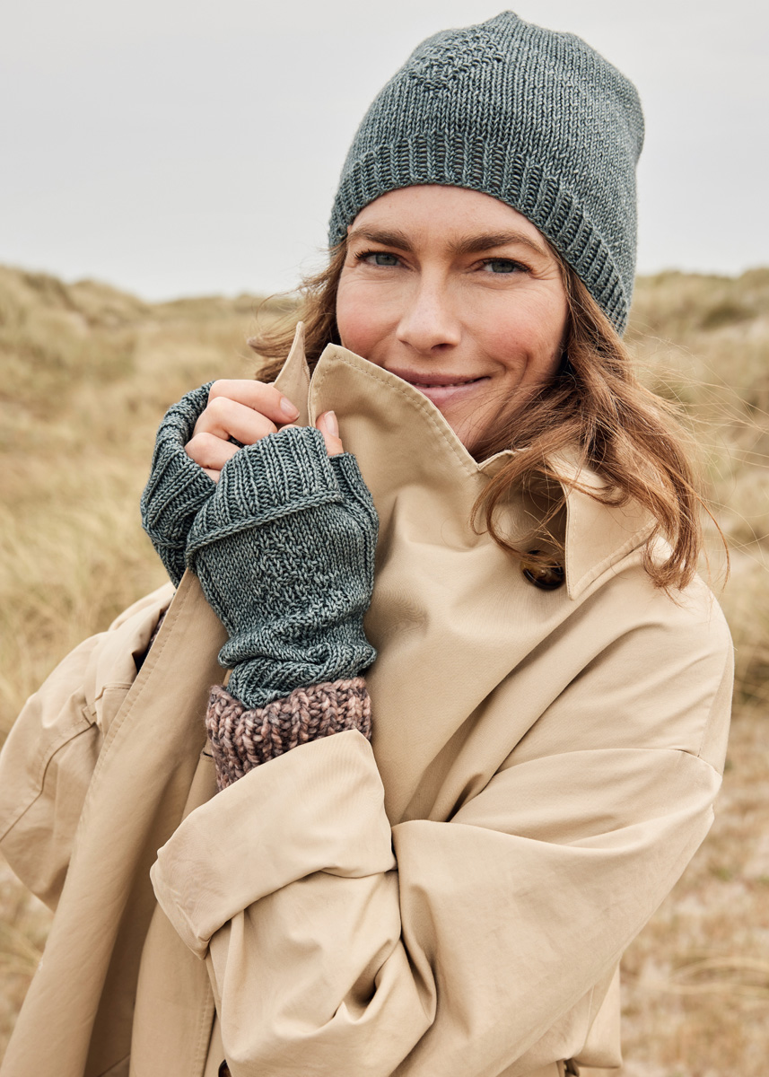 Lana Grossa-Qualität „Cool Wool Vintage“ (100% Schurwolle (Merino extrafine), LL = ca. 160 m/50 g); 100 g Graugrün (Fb 7368); ein Nadelspiel Nr. 3 oder 3,5