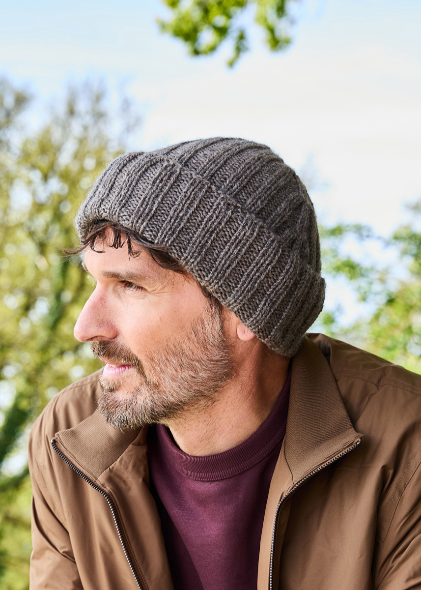 Lana Grossa-Qualität „Landlust- Naturwolle“ (100% norwegische Schurwolle, LL ca. 85 m/50 g), 100 g in Graubraun (Fb 14); 1 Rundstricknadel Nr. 4,5, 40 cm lang, 1 Nadelspiel Nr. 4,5, 2 Maschenmarkierer.