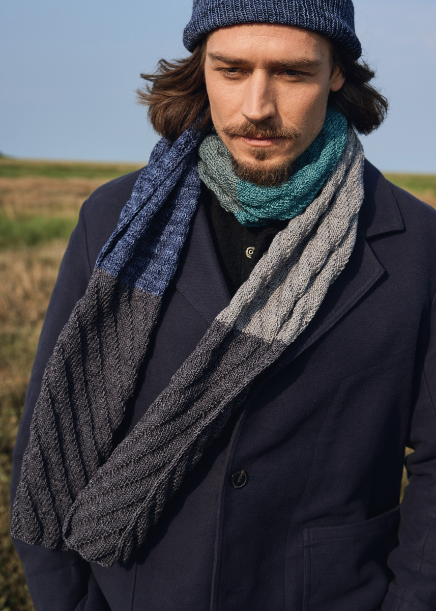 Lana Grossa-Qualität „Cool Wool Vintage“ (100% Schurwolle (Merino extrafine) LL = ca. 160 m/50 g); 100 g Anthrazit (Fb 7370); je 50 g Hellgrau (Fb 7369), Grüngrau (Fb 7368), Petrol (Fb 7367) und Dunkelblau (Fb 7366); Stricknadeln Nr. 3,5 oder 4