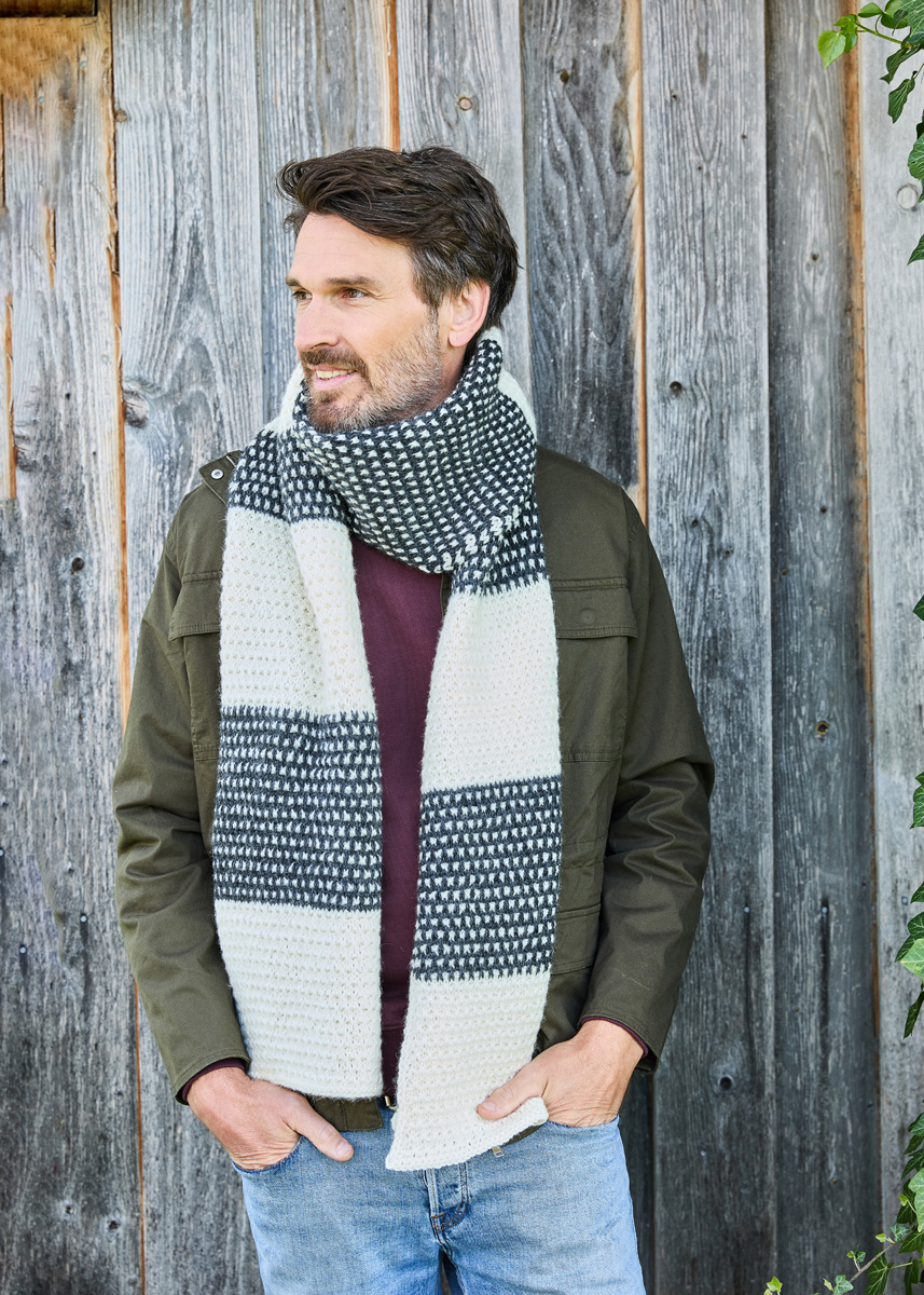 Lana Grossa-Qualität „Landlust- Naturwolle“ (100% Schurwolle, LL ca. 85 m/50 g), 350 g in Wollweiß (Fb 1) und 150 g in Anthrazit (Fb 10); Stricknadeln Nr. 5.