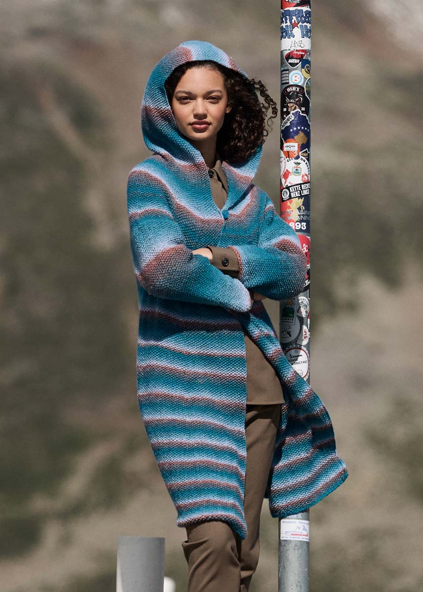Der Hoodie-Mantel wird von oben nach unten, begonnen mit der Kapuze, in einem Stück gestrickt.
