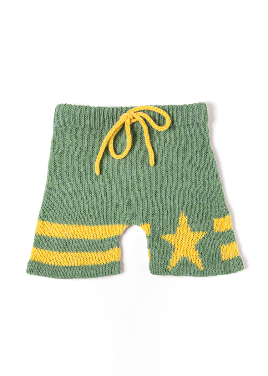 Lana Grossa Ecopuno (72% Baumwolle, 17% Schurwolle (Merino), 11% Alpaka (Baby); LL = 215 m/50 g): 50 (50/100/100) g Resedagrün (Fb. 20) und 50 g Gelb (Fb. 95); je eine Rundstricknadel 3,5 mm und 4 mm; Maschenmarkierer; 44 (48/52/56) cm Gummiband, 3 cm breit.