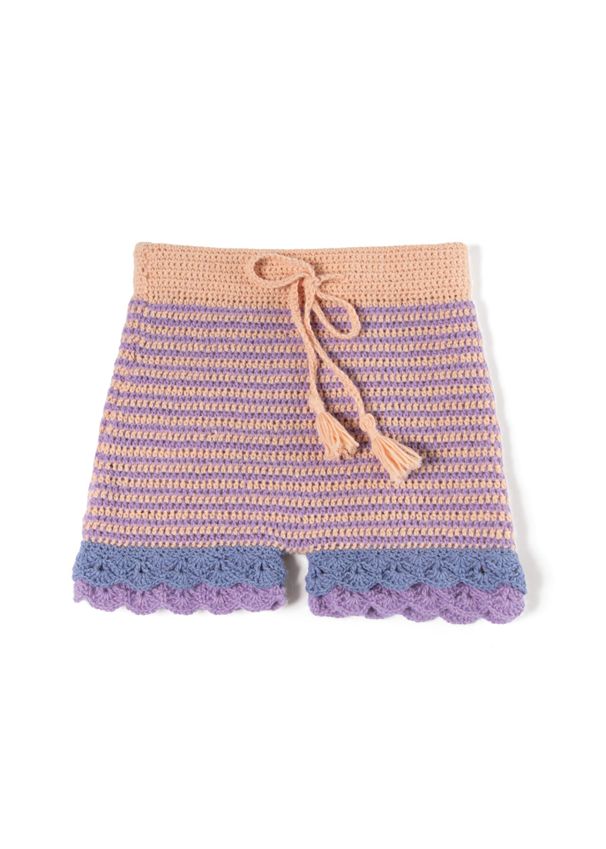 Lana Grossa Ecopuno (72% Baumwolle, 17% Schurwolle (Merino), 11% Alpaka (Baby); LL = 215 m/50 g): 50 (50/100/100) g Apricot (Fb. 99) und je 50 g Lila (Fb. 92), und Lilablau (Fb. 214); eine Häkelnadel 3,5 mm; entfernbare Maschenmarkierer (alternativ Sicherheitsnadeln); 38 (42/46/52) cm Gummiband, 3 cm breit.