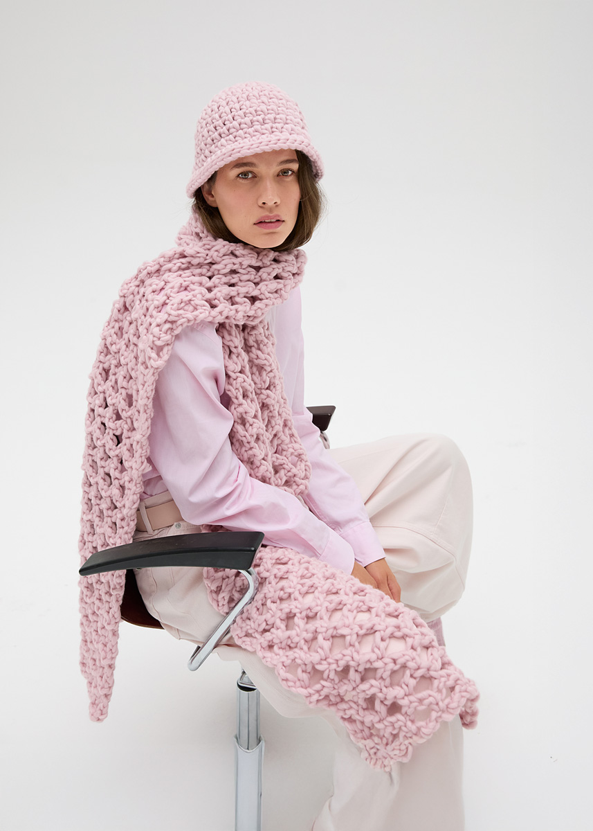 Lana Grossa „Confetti“ (100 % Schurwolle (Merino extrafine), LL = 50 m/100 g): 200 g Rosé (Fb 914); Häkelnadel Nr 10.