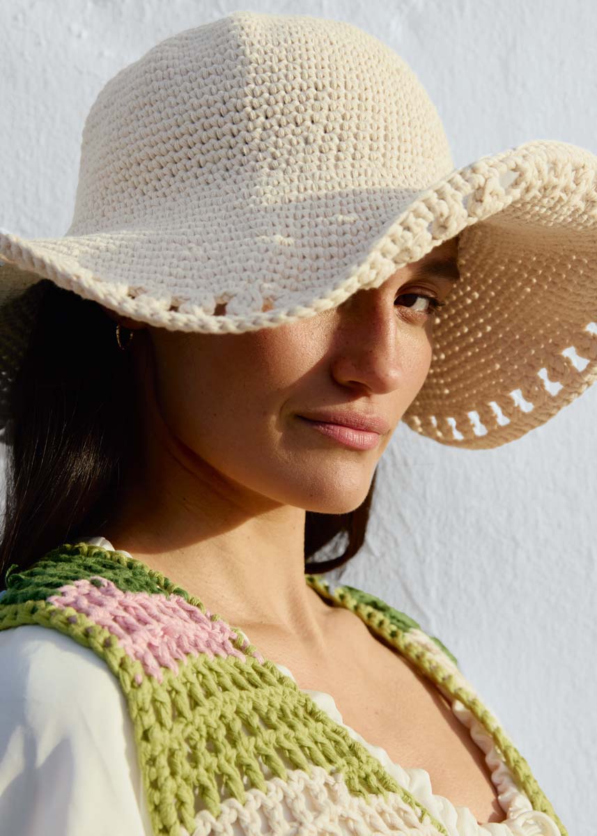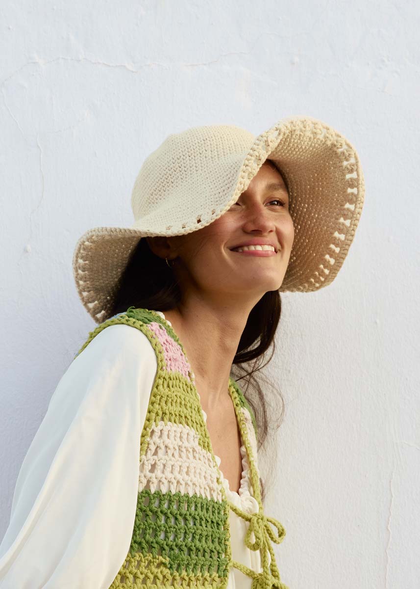 Lana Grossa-Qualität „Natural Cotton” (100 % (Bio) Baumwolle, LL = ca. 80 m/50 g): ca. 200 g Eierschale (Fb. 18); 1 Wollhäkelnadel Nr. 4,5; ca. 135 cm Hutdraht aus Kunststoff, 1,25 mm dick, mit Verbindungshülse, z. B. zu beziehen über www.seidenversand. de.