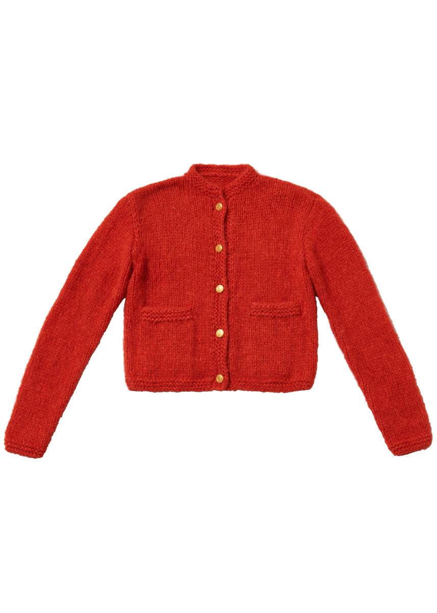 Garn von Lana Grossa, Qualität „Brigitte No. 2“ (47 % Alpaka, 45 % Baumwolle, 8 % Schurwolle, Lauflänge 140 m/50 g): 200 (250/ 250/250) g in Koralle Nr. 25; Qualität „Brigitte No. 3“ (20 % Mohair, 57 % Schurwolle, 23 % Polyamid, Lauflänge 100 m/ 25 g): 275 (300/325/350) g in Feuerrot Nr. 54. Stricknadeln 7 und 8 (wenn Sie locker stricken) oder 8 und 9 (wenn Sie fest stricken) – wichtig ist, dass Sie auf die Angaben in der Maschenprobe kommen. 1 Rundstricknadel 7 (wenn Sie locker stricken) oder 8 (wenn Sie fest stricken). 5 Knöpfe in Gold Nr. 843, 20 mm Durchmesser, Artikel- Nr. 453655 von Union Knopf.