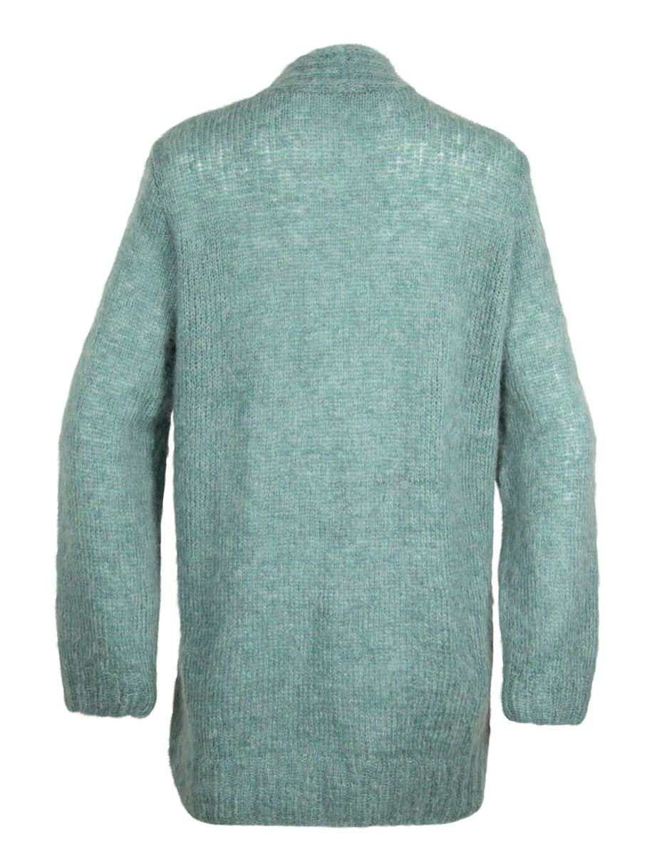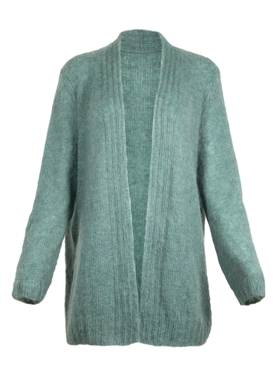 Lana Grossa Brigitte No. 3 (40% Mohair, 37% Schurwolle, 23% Polyamid, Lauflänge 100 m/25 g), 275 (300/325) g in Graugrün (Fb 17); Stricknadel Nr. 4,5.