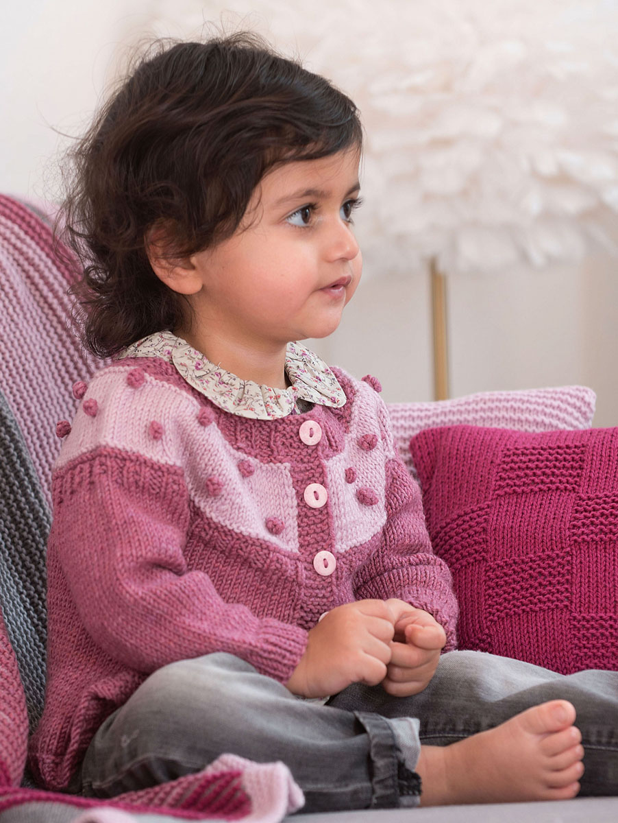 Lana Grossa Cool Wool Big melange (100 % Schurwolle, Lauflänge 120 m/50 g) 150 (150/150/200) g Altrosa meliert (Fb 330) und 50 g Rosa meliert (Fb 334); Stricknadeln Nr. 4,5; eine 40 cm lange Rundstricknadel Nr. 4,5; Häkelnadel Nr. 4; 4 Knöpfe mit 15 mm Ø.