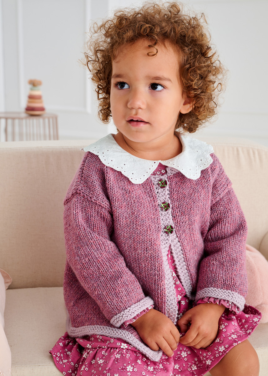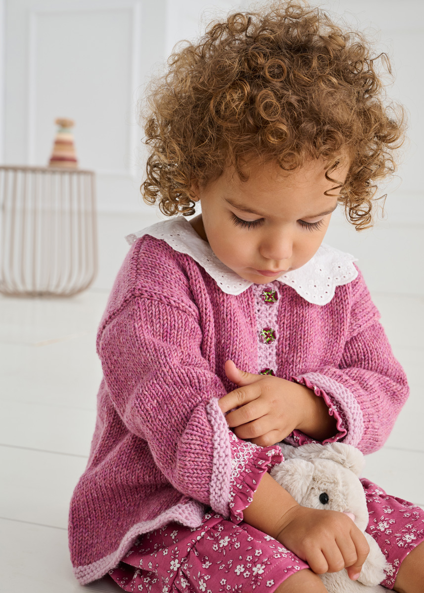 Lana Grossa Cool Wool Big Vintage (100% Schurwolle (Merino extrafine); LL = 120 m/50 g): 200 g Pink (Fb. 7189) und Lana Grossa Cool Wool Big (100% Schurwolle (Merino extrafine); LL = 120 m/50 g): 50 g Rosa (Fb. 963); eine Rundstricknadel 4 mm; 2 Nadeln eines Nadelspiels 4 mm; 3 Knöpfe mit 15 mm Ø.