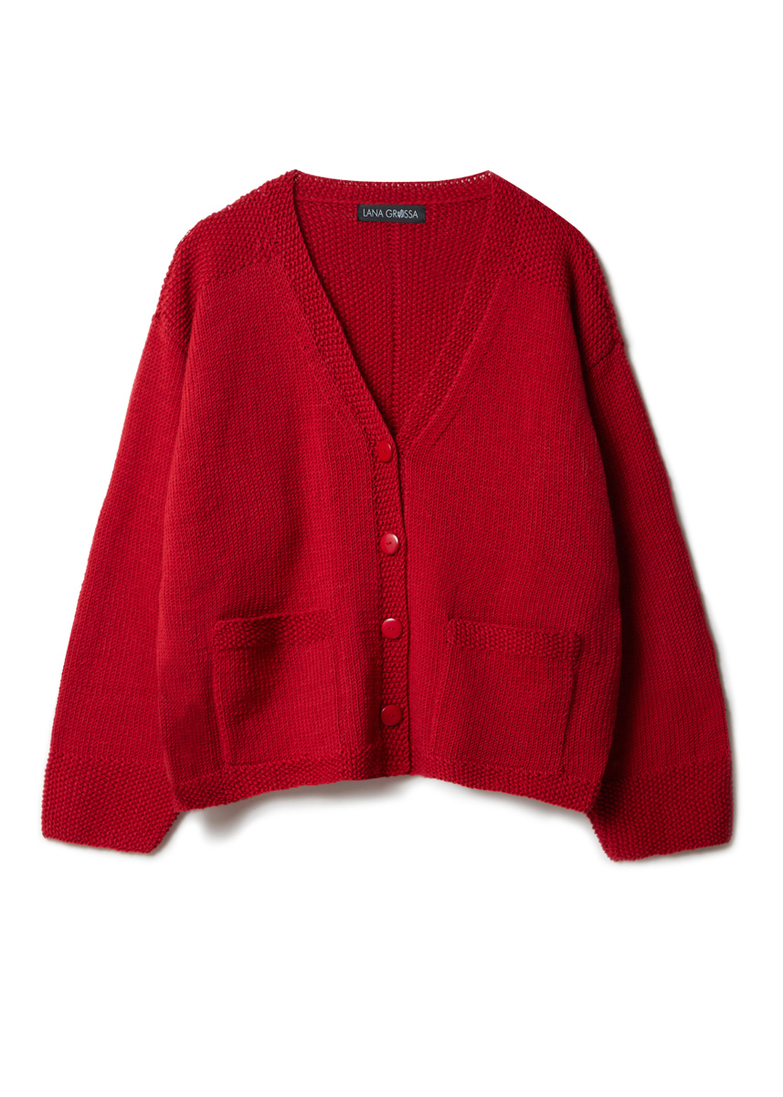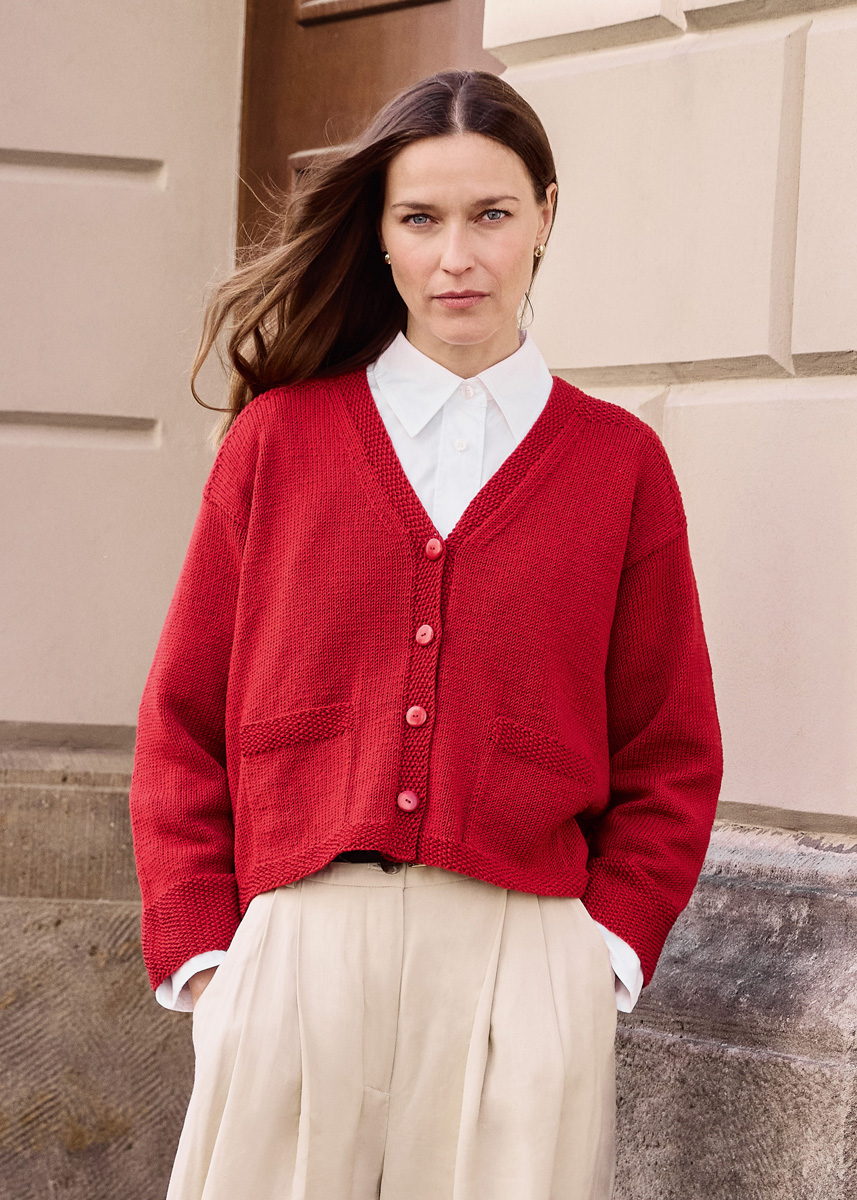 Lana Grossa Cool Wool (100% Schurwolle (Merino extrafein), Lauflänge 160 m/50 g), 550 (600 – 650) g Dunkelrot (Fb. 514); Stricknadeln Nr. 3,5 und 4, 1 Rundstricknadel Nr. 3,5, 120 cm lang und 4 Knöpfe von UNION KNOPF, Art. 454233, Fb. 50, Ø 20 mm.