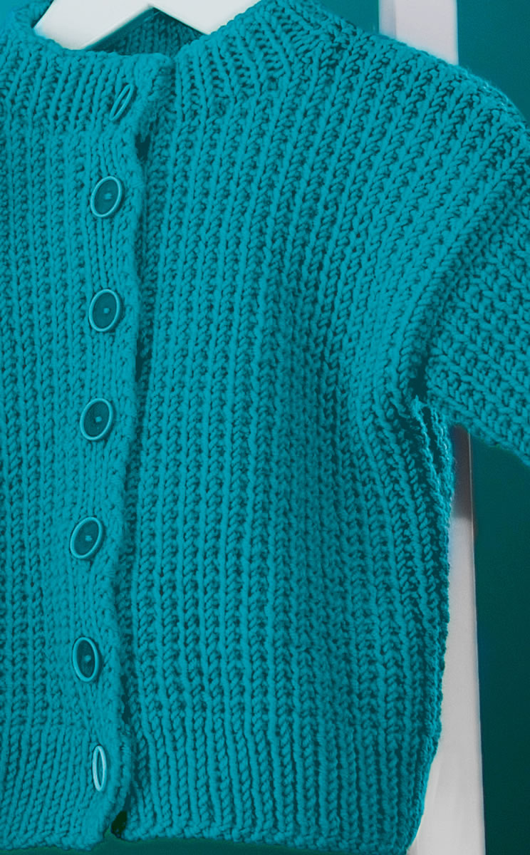Lana Grossa Qualität "Cool Wool", 100 % Schurwolle, Lauflänge 160 m/50 g; 150 g Türkis (Fb 502); Stricknadeln Nr. 3,5, eine kurze Rundstricknadel Nr. 3,5; 7 Knöpfe.